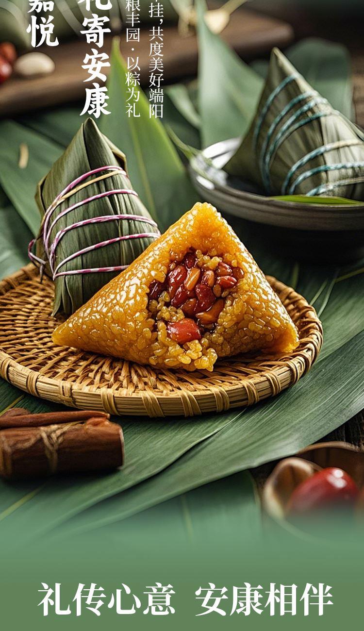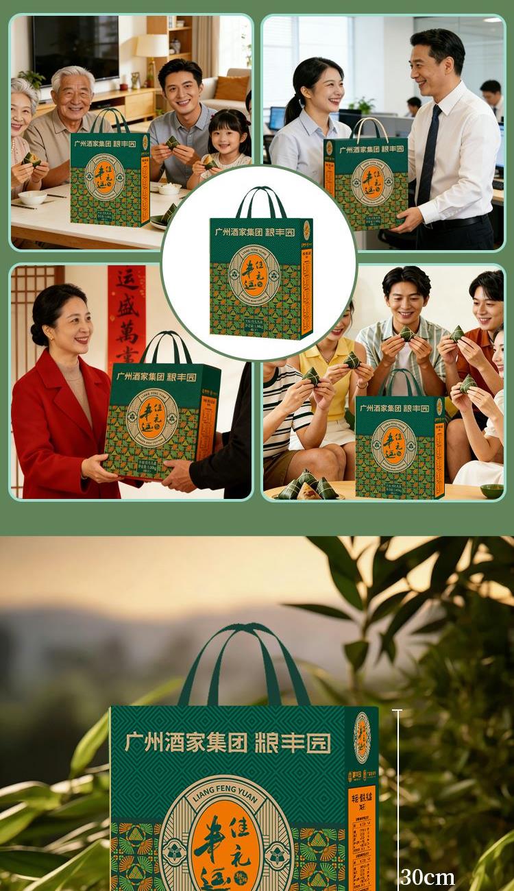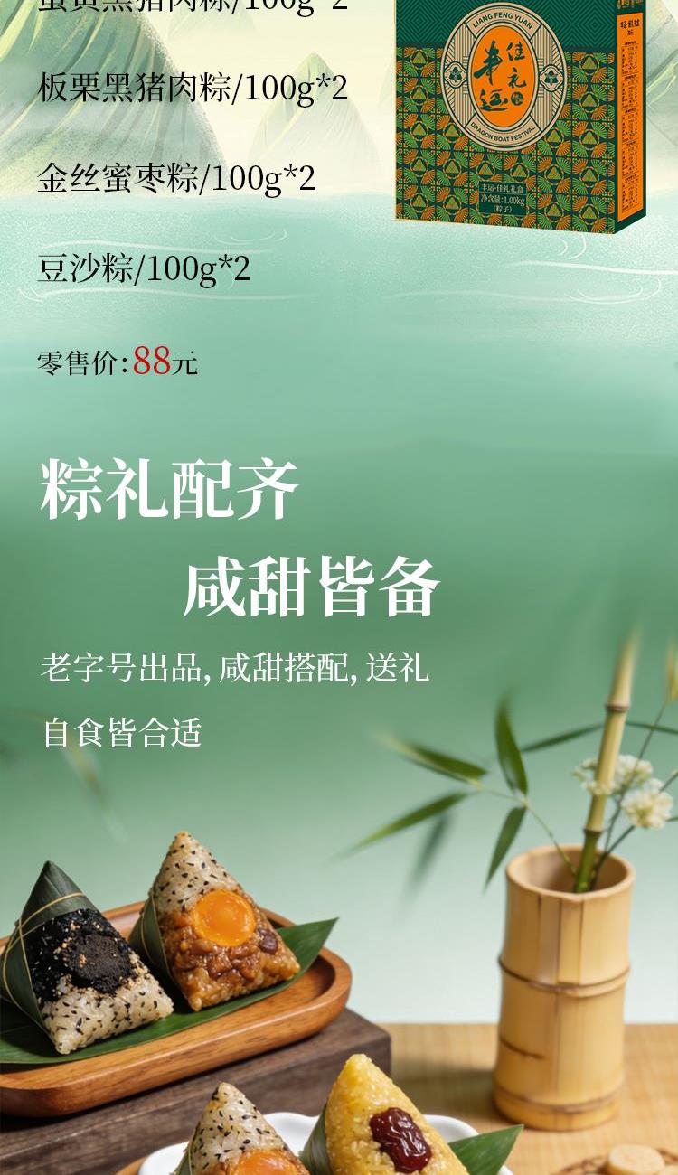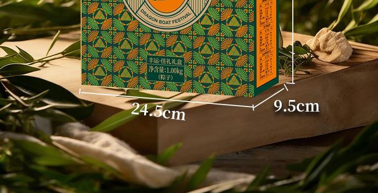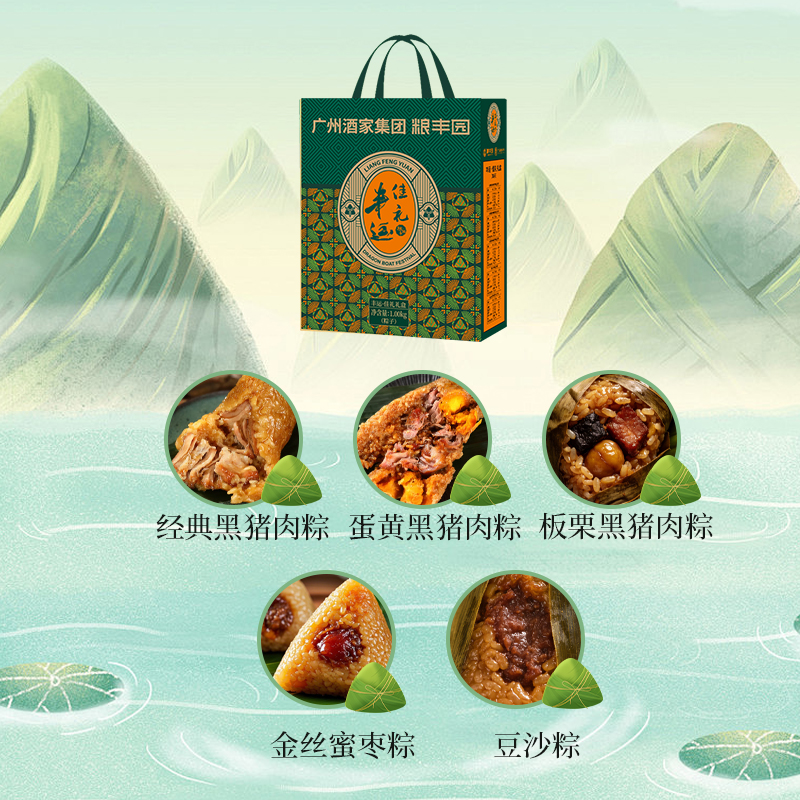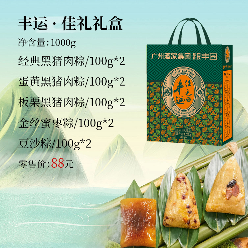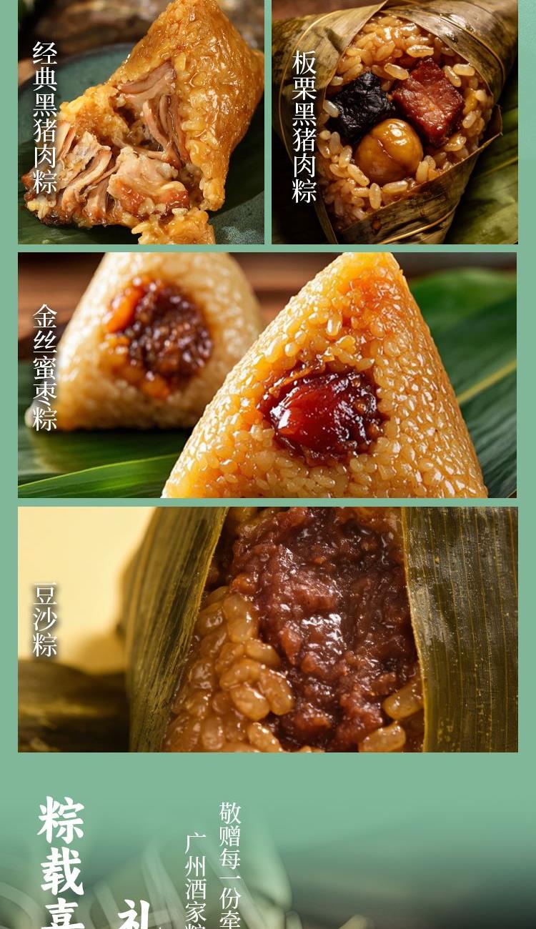 礼盒尺寸:24.5*30*9.5 内容物: 经典黑猪肉粽/100g*2 蛋黄黑猪肉粽/100g*2 板栗黑猪肉粽/100g*2 金丝蜜枣粽/100g*2 豆沙粽/100g*2 规格:1000g 保质期:9个月 百年广府,地道粤味,广州酒家 非遗匠心,粤菜标杆,国民品质之选 一席岭南风味,四季匠心好礼,认准广州酒家