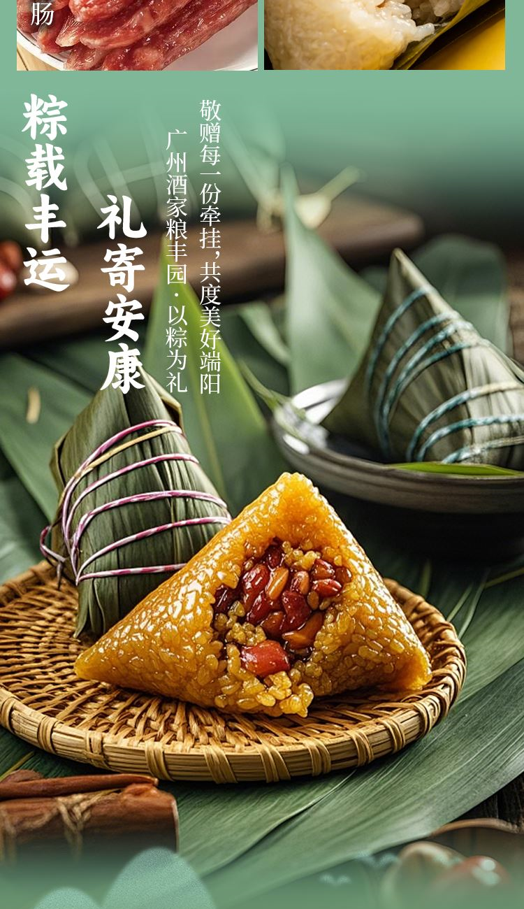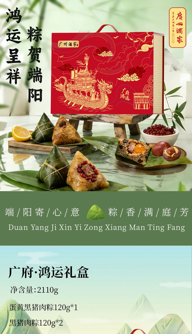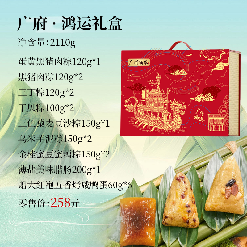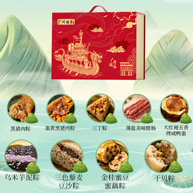 礼盒尺寸:40*29*13 内容物: 蛋黄黑猪肉粽120g * 1 黑猪肉粽120g * 2 三丁粽120g * 2 干贝粽100g * 2 三色藜麦豆沙粽150g * 1 乌米芋泥粽150g * 2 金桂蜜豆蜜藕粽150g * 2 薄盐美味腊肠200g * 1 赠大红袍五香烤咸鸭蛋60g * 6 规格:2110g 保质期:3个月 百年广府,地道粤味,广州酒家 非遗匠心,粤菜标杆,国民品质之选 一席岭南风味,四季匠心好礼,认准广州酒家