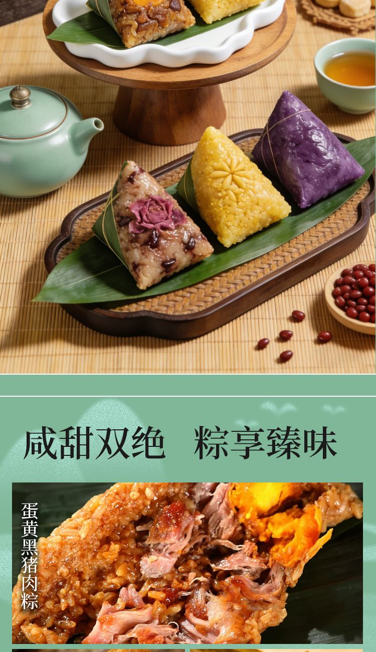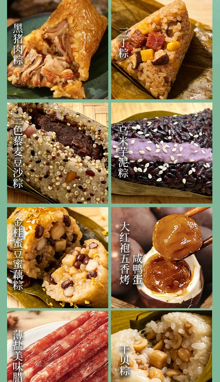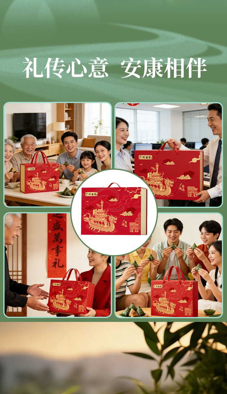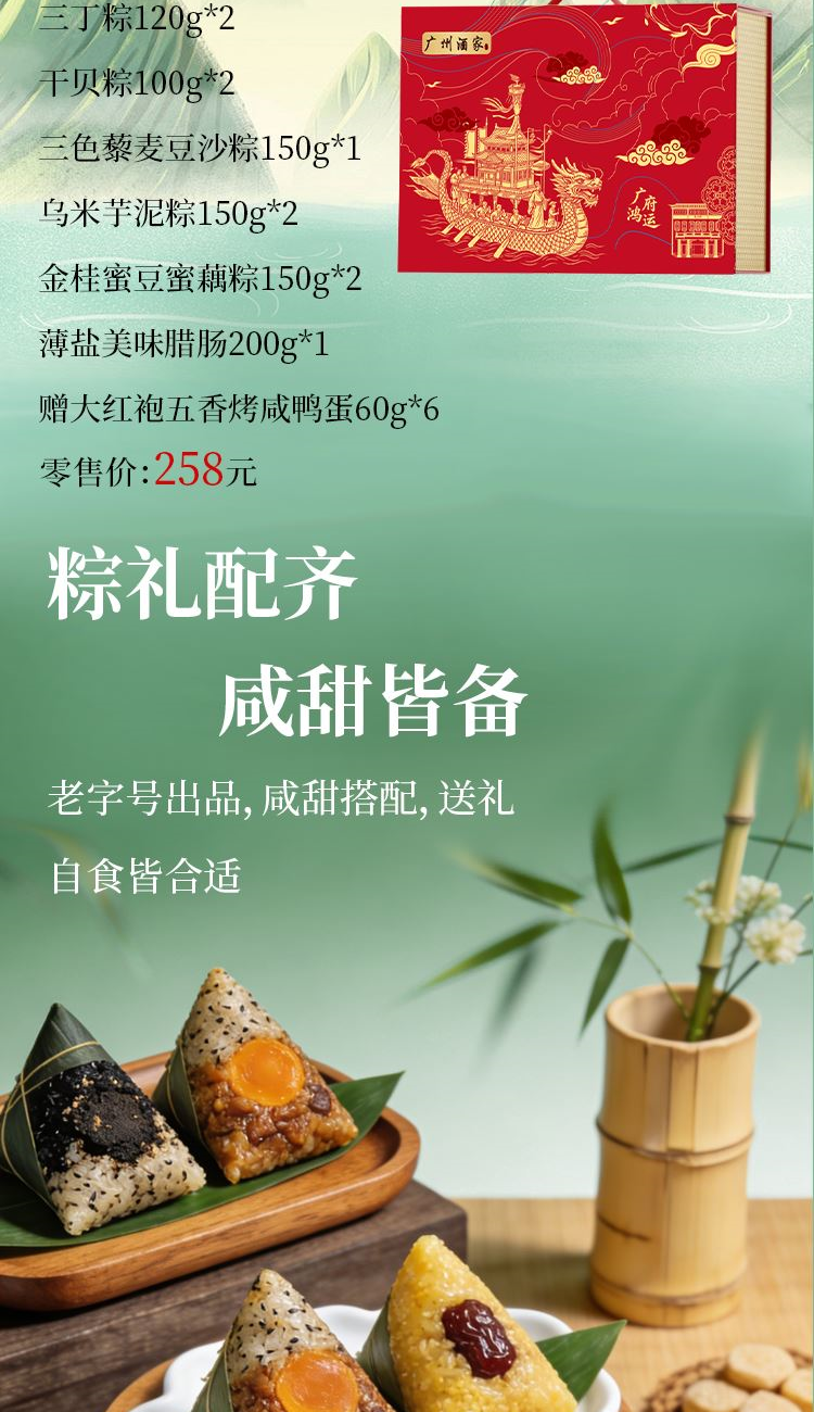礼盒尺寸:40*29*13 内容物: 蛋黄黑猪肉粽120g * 1 黑猪肉粽120g * 2 三丁粽120g * 2 干贝粽100g * 2 三色藜麦豆沙粽150g * 1 乌米芋泥粽150g * 2 金桂蜜豆蜜藕粽150g * 2 薄盐美味腊肠200g * 1 赠大红袍五香烤咸鸭蛋60g * 6 规格:2110g 保质期:3个月 百年广府,地道粤味,广州酒家 非遗匠心,粤菜标杆,国民品质之选 一席岭南风味,四季匠心好礼,认准广州酒家