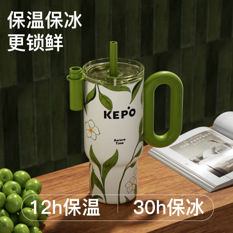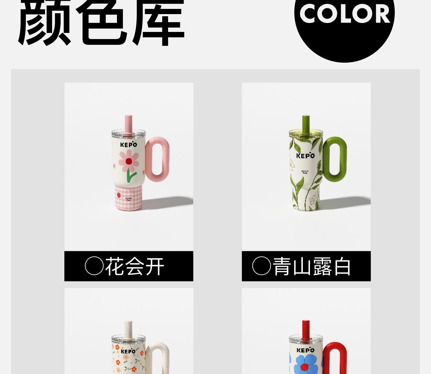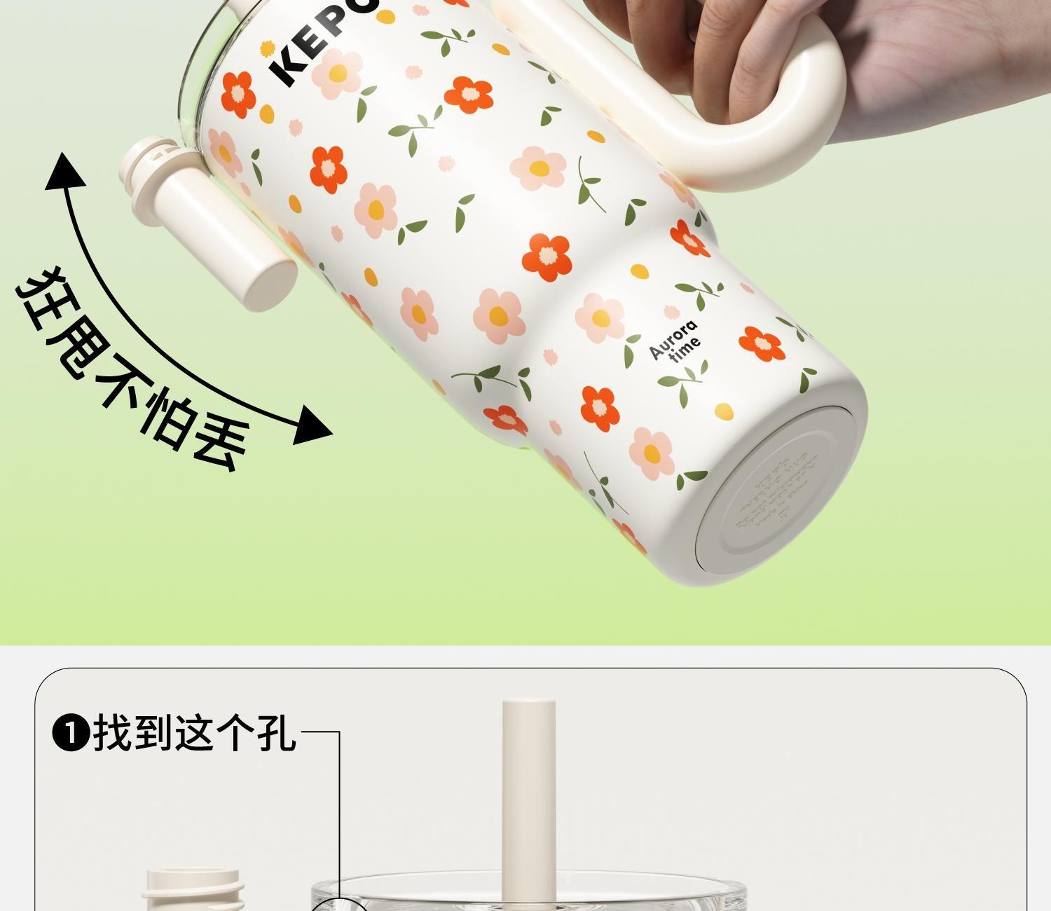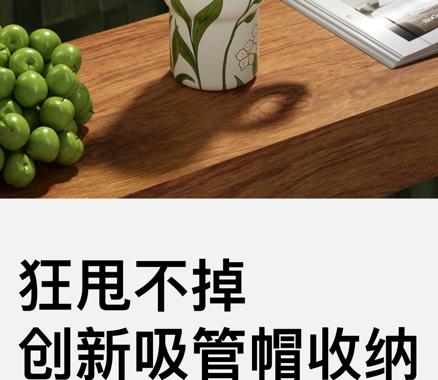 材质:316L不锈钢、硅胶、Tritan 颜色:浮春、花会开、青山露白、慵懒夏日 包装:彩盒 (1)双重防漏,安心放在包包里 (2)大容量,满足一天的饮水量 (3)车载可用设计 (4)圆润把手,便携外带,握持舒适 (5)长效保温、保冷(12H)