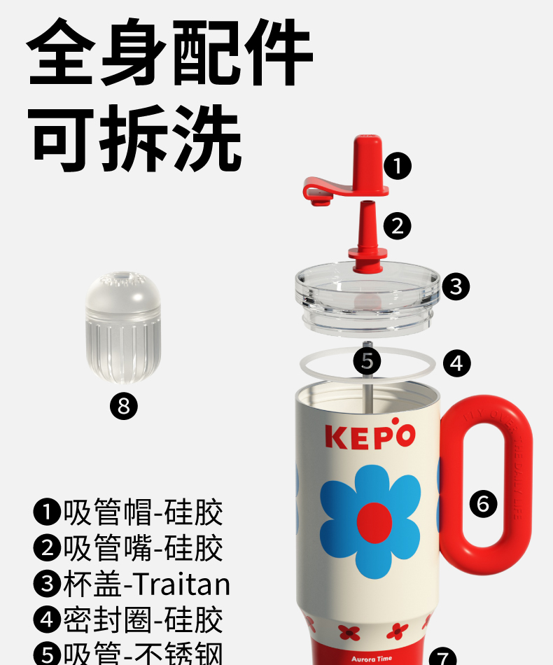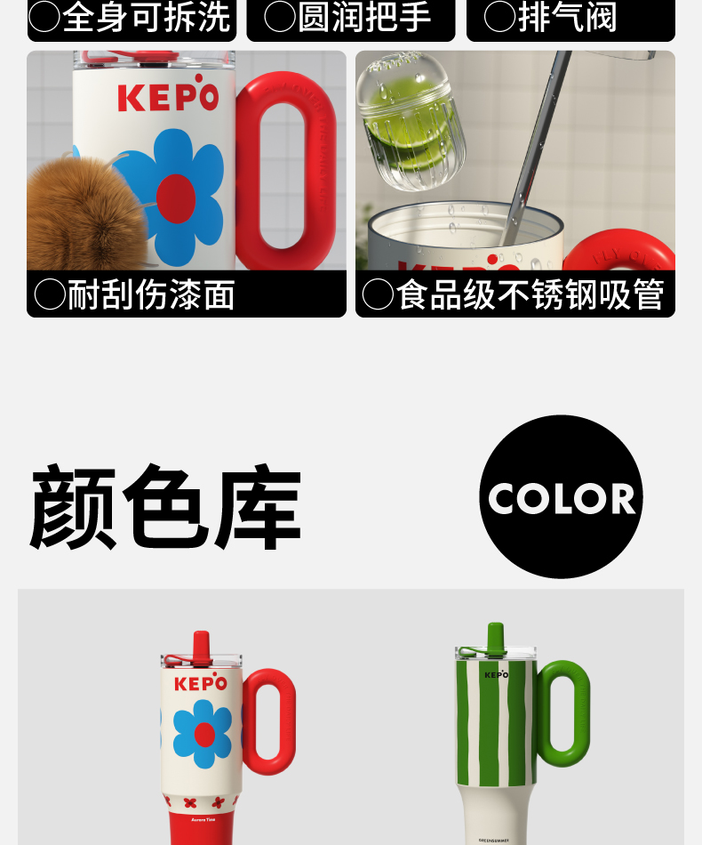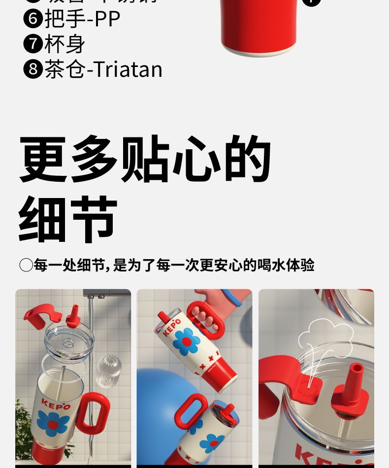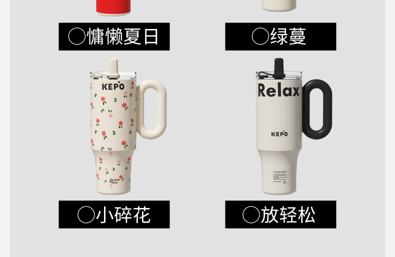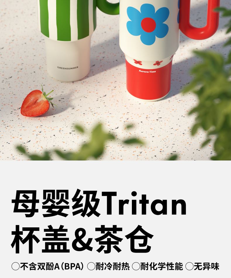 材质:陶瓷覆层内胆、硅胶、PP、Tritan 颜色:绿蔓、小碎花、慵懒夏日、放轻松 包装:彩盒 (1)硅胶吸管盖,一掀即喝,畅饮一整天 (2)大容量,满足一天的饮水量 (3)车载可用设计 (4)圆润把手,便携外带,握持舒适 (5)长效保温、保冷(12H)