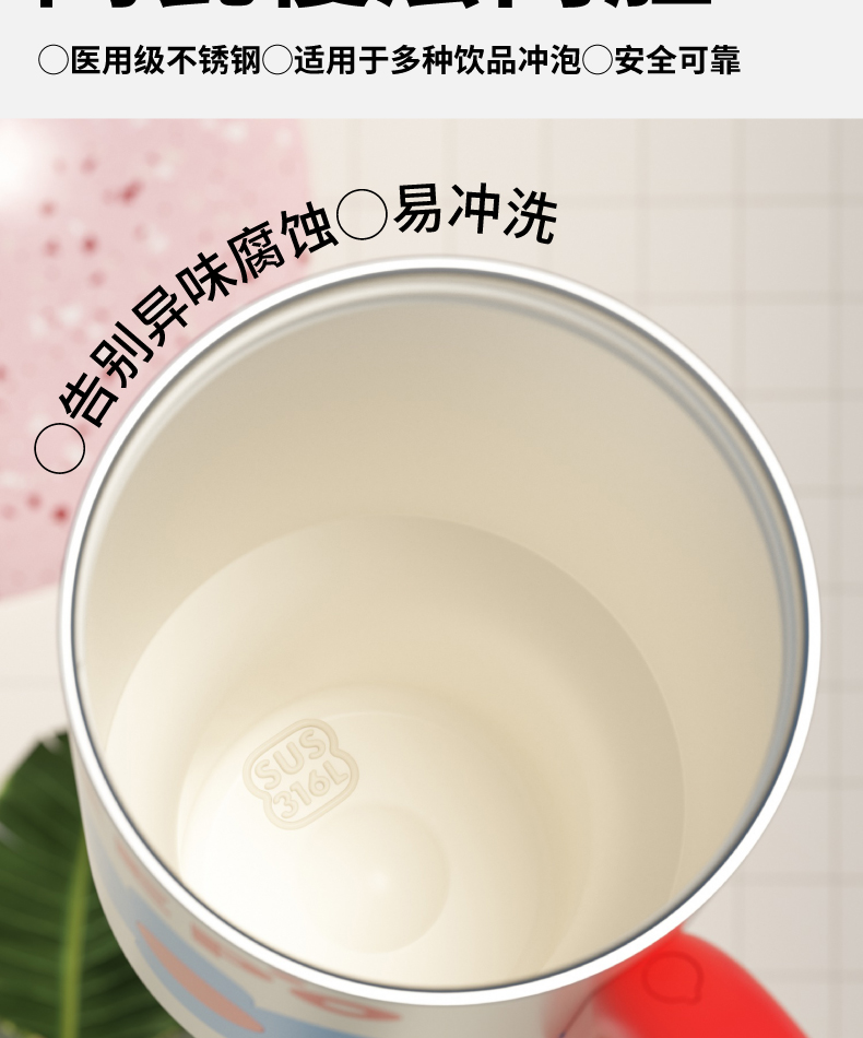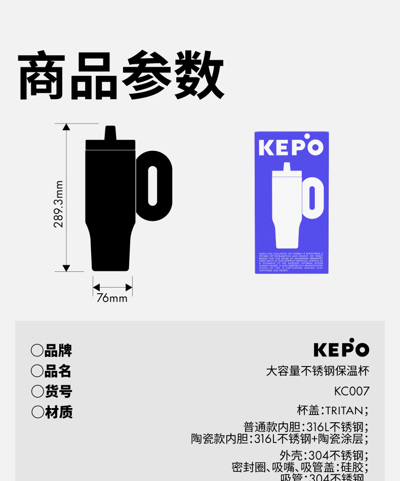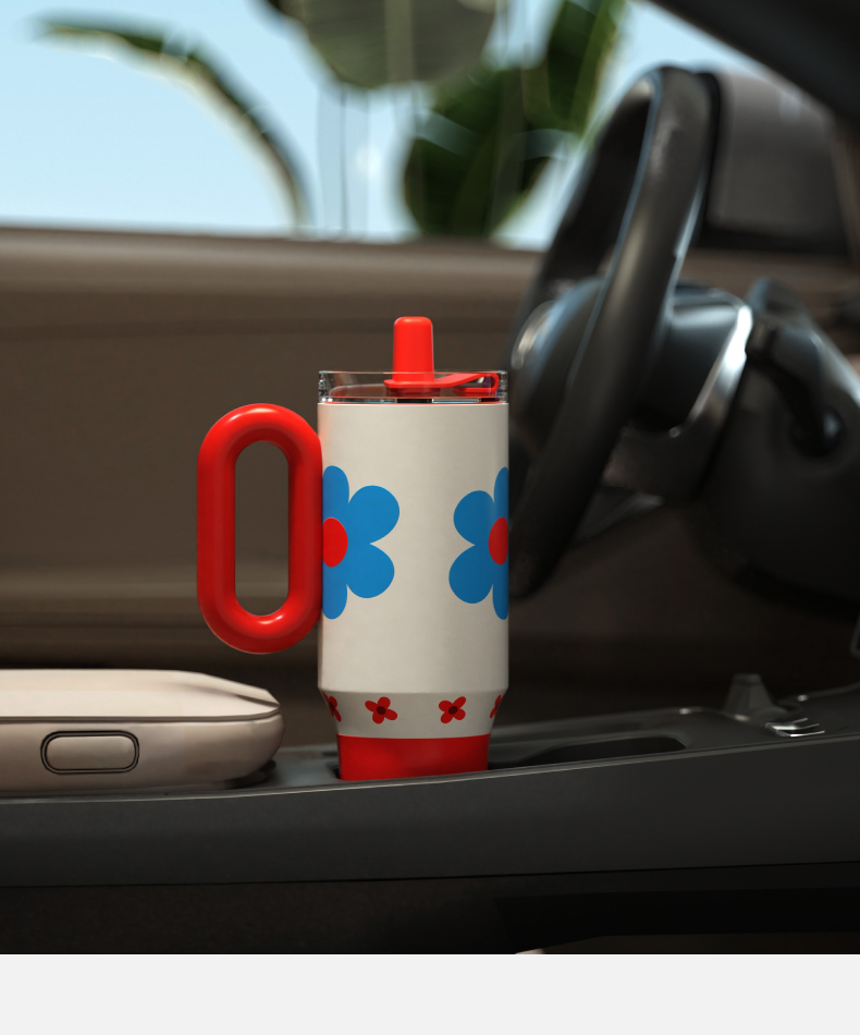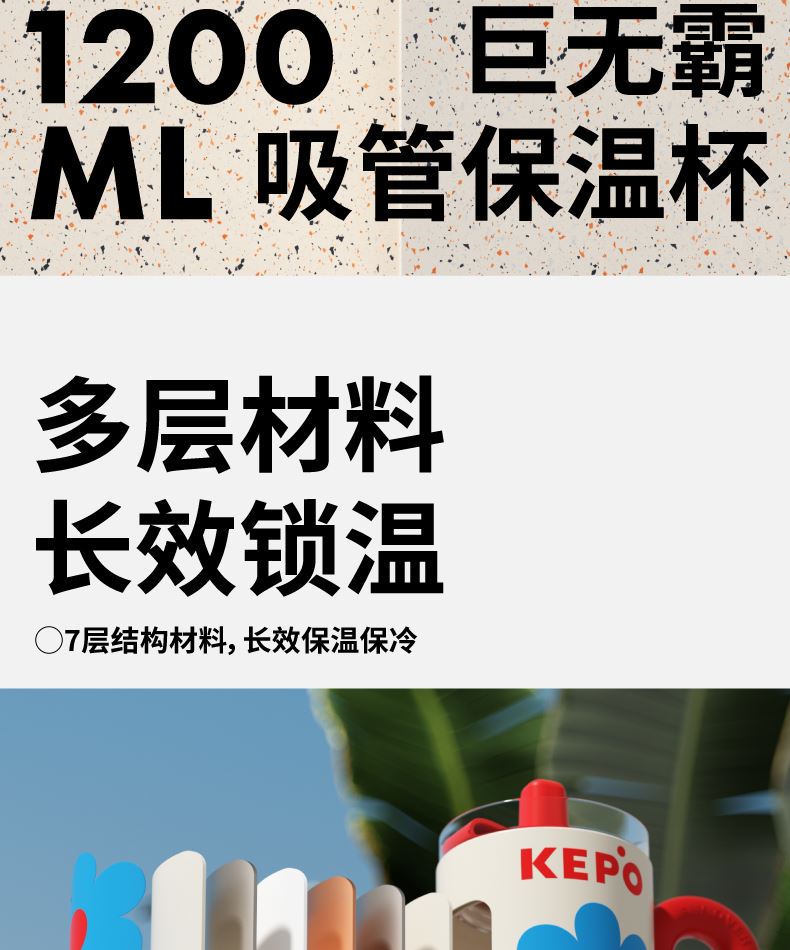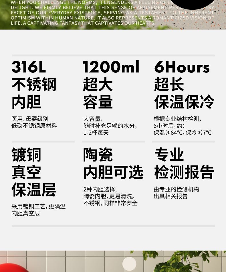 材质:陶瓷覆层内胆、硅胶、PP、Tritan 颜色:绿蔓、小碎花、慵懒夏日、放轻松 包装:彩盒 (1)硅胶吸管盖,一掀即喝,畅饮一整天 (2)大容量,满足一天的饮水量 (3)车载可用设计 (4)圆润把手,便携外带,握持舒适 (5)长效保温、保冷(12H)