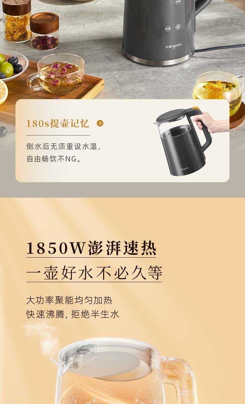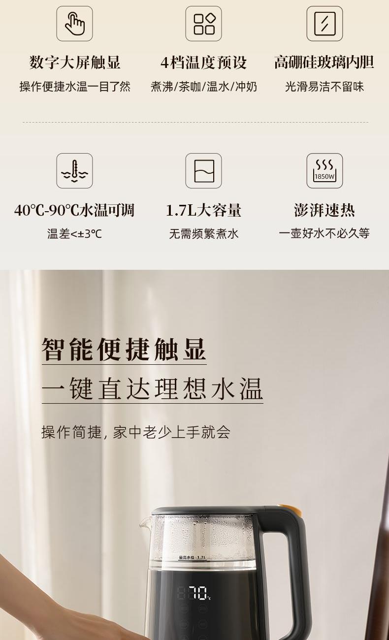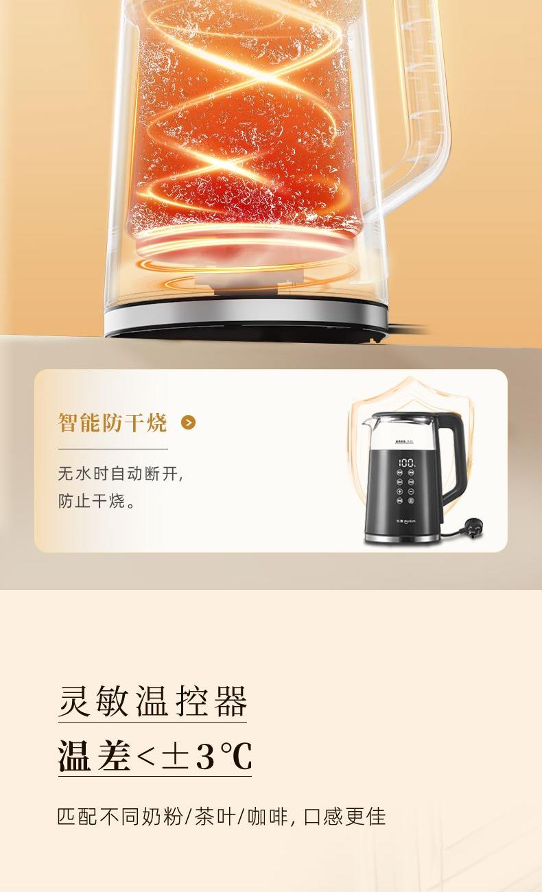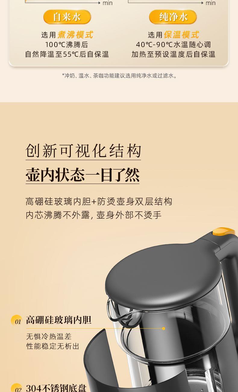 数字大屏触显,操作便携水温一目了然 4档温度预设,煮沸/茶咖/温水/冲奶 高硼硅玻璃内胆,光滑易洁不留味 双层壶身不烫水,两小时持久保温