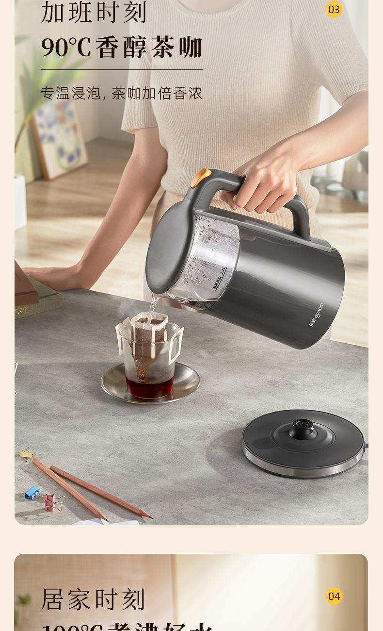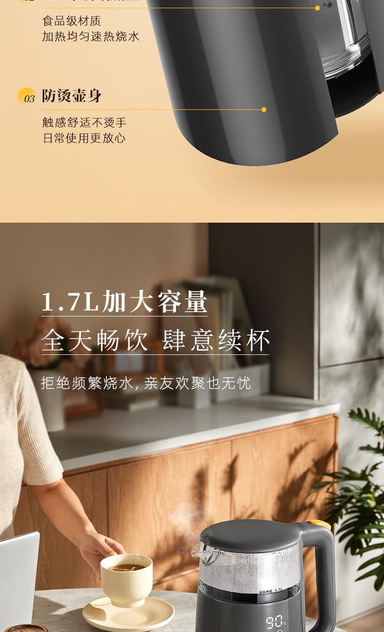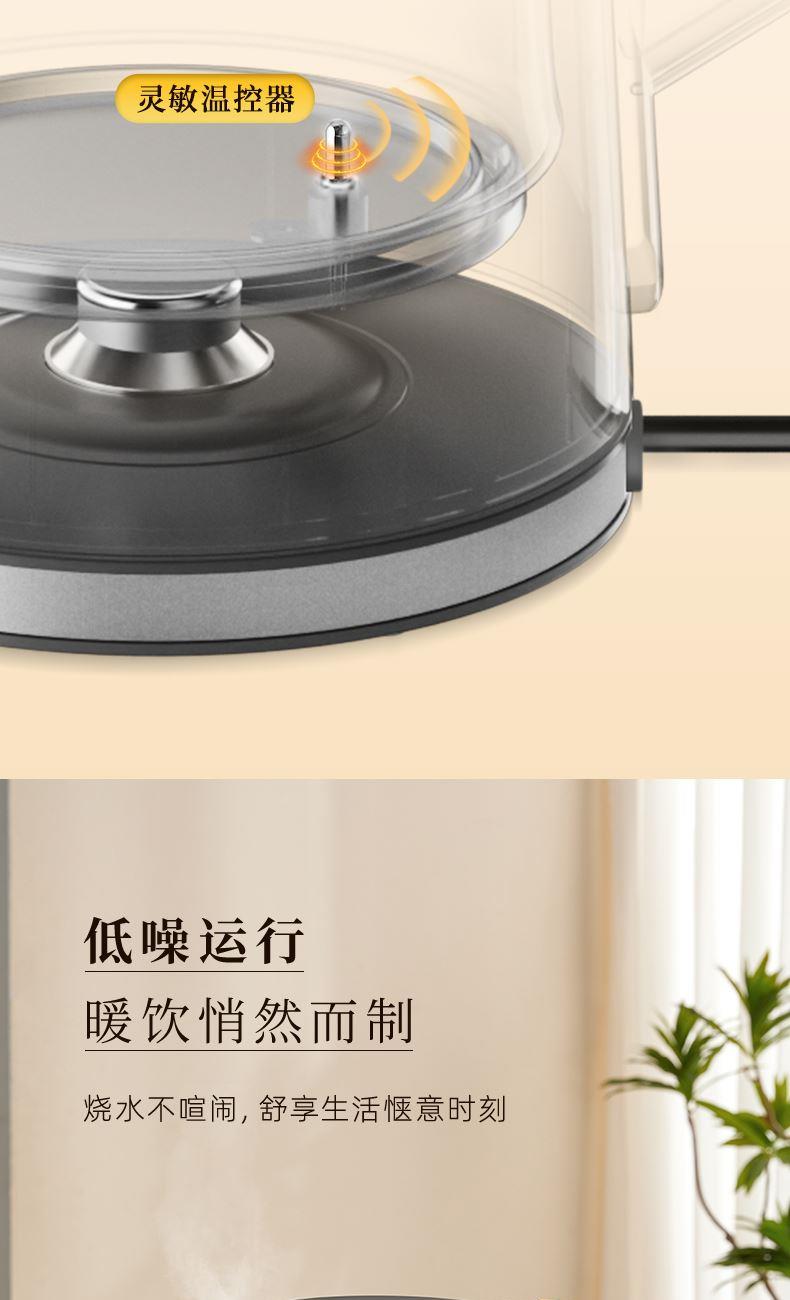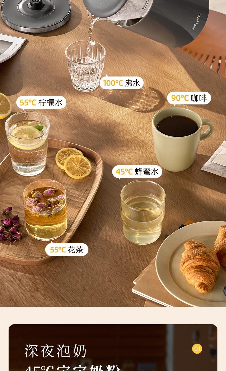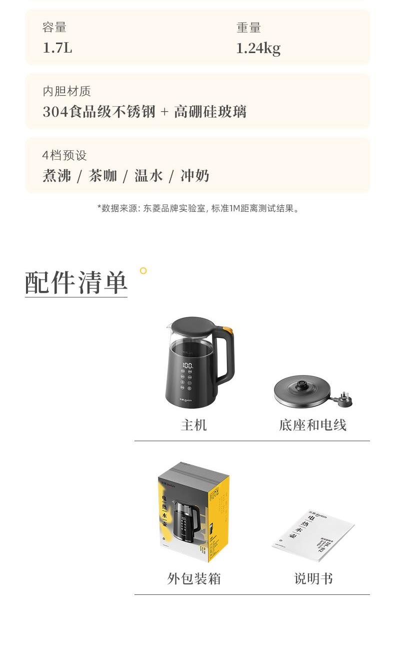 数字大屏触显,操作便携水温一目了然 4档温度预设,煮沸/茶咖/温水/冲奶 高硼硅玻璃内胆,光滑易洁不留味 双层壶身不烫水,两小时持久保温