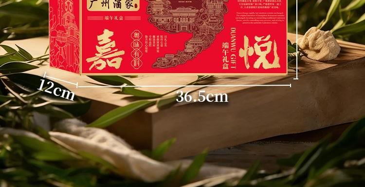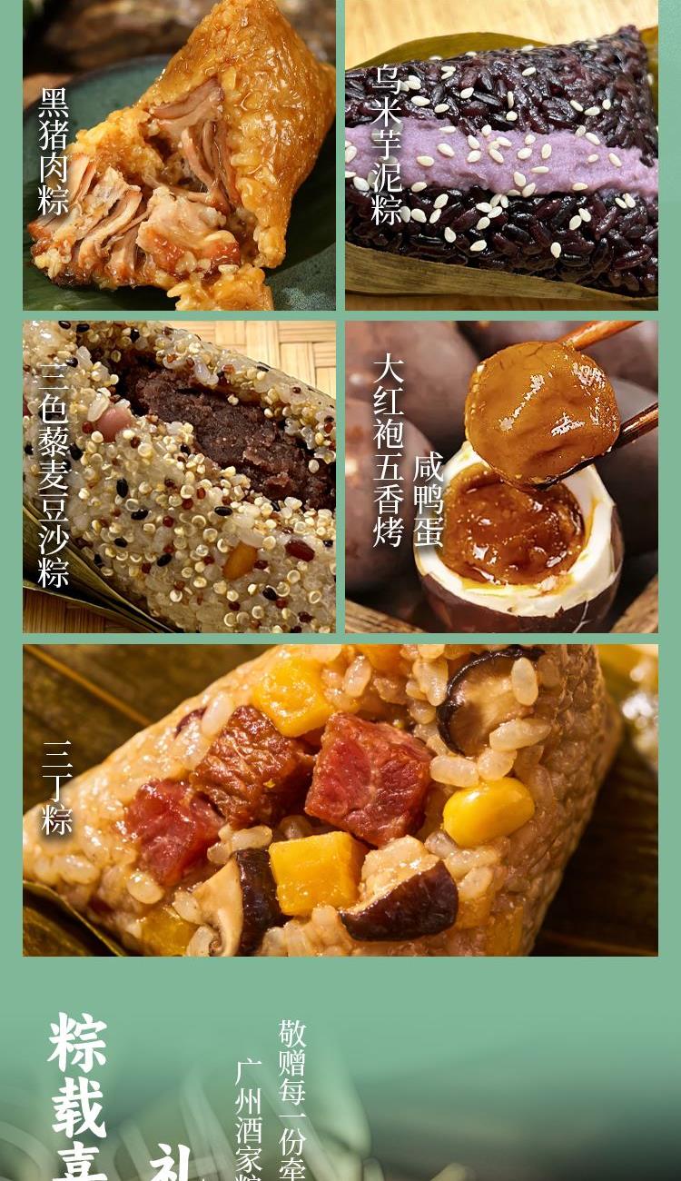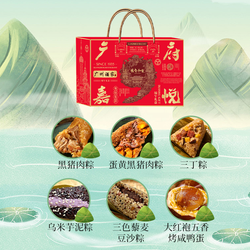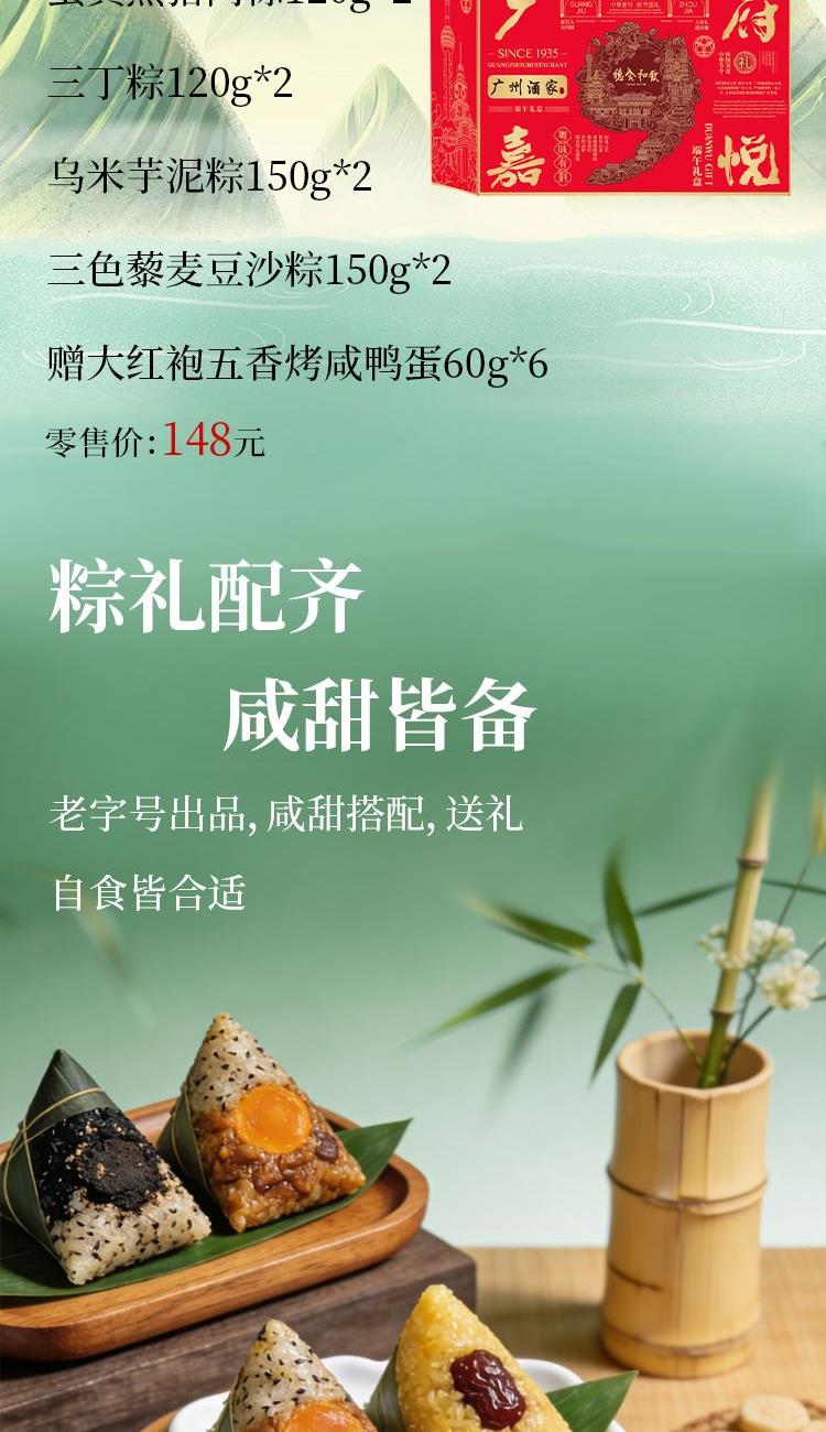 礼盒尺寸:36.5*26*12 内容物: 黑猪肉粽120g * 2 蛋黄黑猪肉粽120g * 2 三丁粽120g * 2 乌米芋泥粽150g * 2 三色藜麦豆沙粽150g * 2 赠大红袍五香烤咸鸭蛋60g * 6 规格:1680g 保质期:6个月 百年广府,地道粤味,广州酒家 非遗匠心,粤菜标杆,国民品质之选 一席岭南风味,四季匠心好礼,认准广州酒家