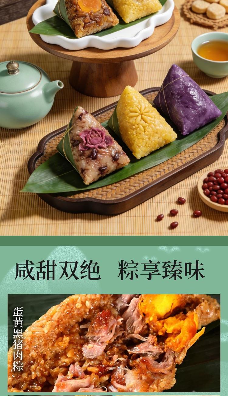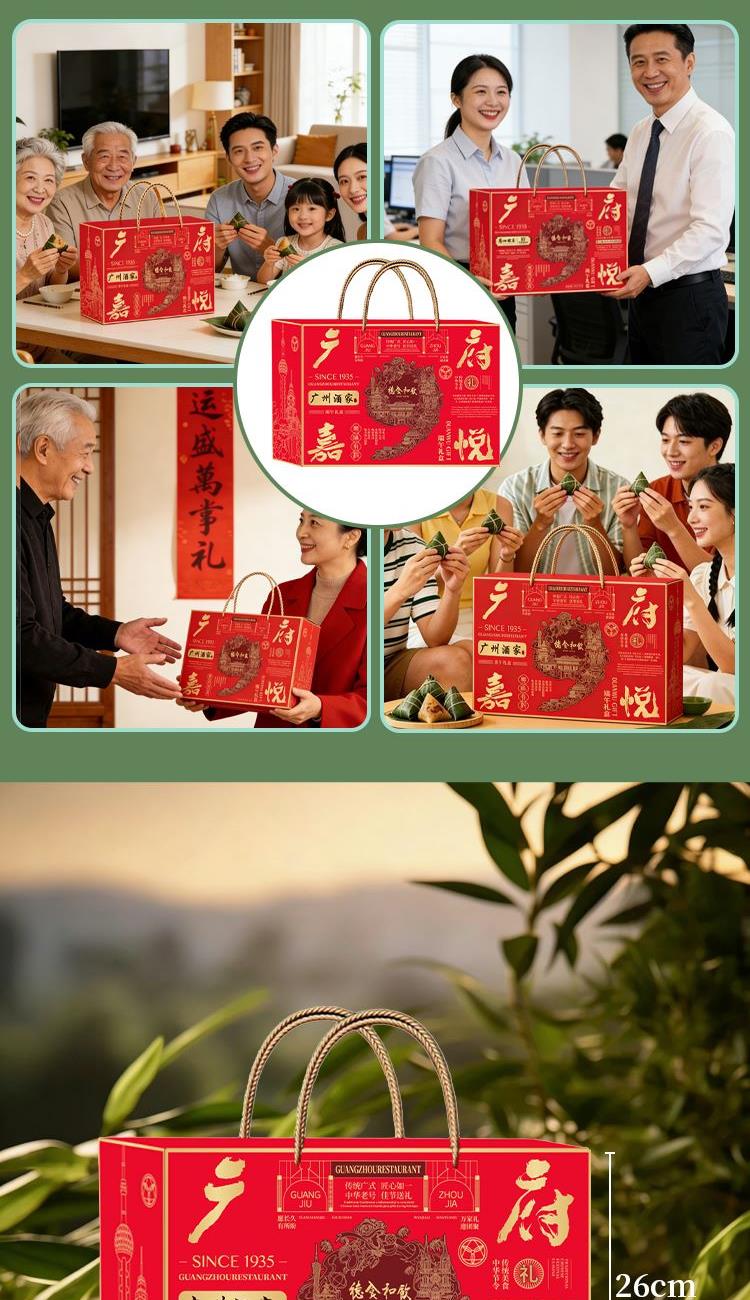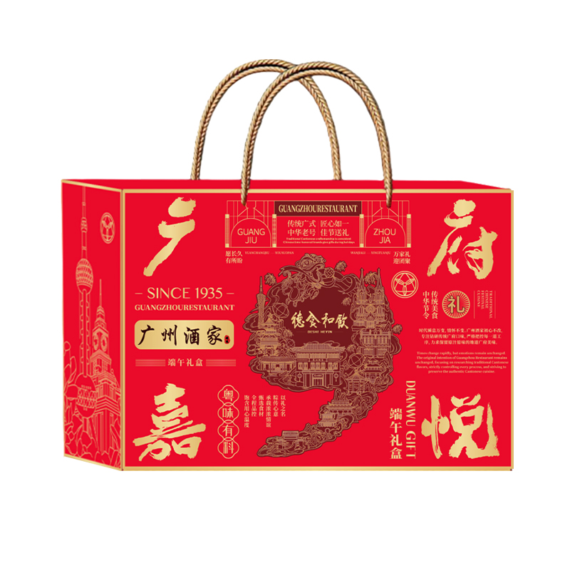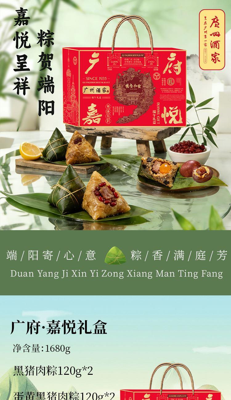 礼盒尺寸:36.5*26*12 内容物: 黑猪肉粽120g * 2 蛋黄黑猪肉粽120g * 2 三丁粽120g * 2 乌米芋泥粽150g * 2 三色藜麦豆沙粽150g * 2 赠大红袍五香烤咸鸭蛋60g * 6 规格:1680g 保质期:6个月 百年广府,地道粤味,广州酒家 非遗匠心,粤菜标杆,国民品质之选 一席岭南风味,四季匠心好礼,认准广州酒家