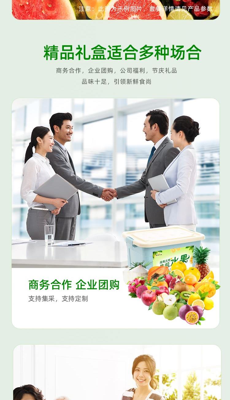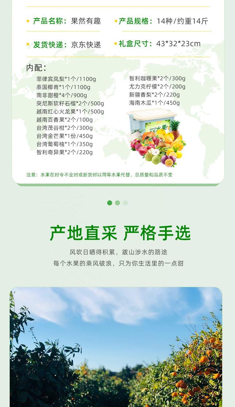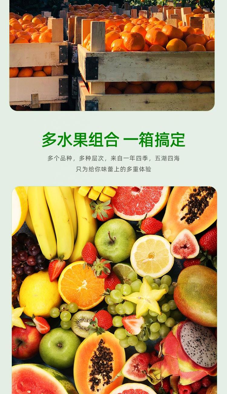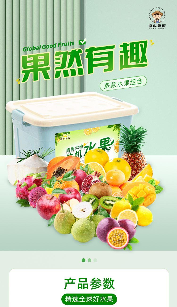 25年12月1日-次年3月底配置如下: 泰国椰青*1个/1100g 赣南脐橙*4个/900g 四川耙耙柑*2个/450g 蜜宝红心火龙果*2个/1000g 越南百香果*2个/100g 南非沃柑*2个/300g 越南芒果*1份/450g 南非葡萄柚*1个/350g 智利奇异果*2个/220g 智利咖喱果*2个/300g 尤力克柠檬*2个/200g 新疆香梨*2个/220g 海南木瓜*1个/500g (福建三红柚*1个/1200g年后凤梨替代) ----------------------------------------------------- 9月1日-11月底内配如下: 菲律宾凤梨*1个/1100g 泰国椰青*1个/1100g 南非甜橙*4个/900g 突尼斯软籽石榴*2个/500g 越南红心火龙果*1个/500g 越南百香果*2个/100g 台湾茂谷柑*2个/300g 台湾金芒果*1份/450g 台湾葡萄柚*1个/350g 智利奇异果*2个/220g 智利咖喱果*2个/300g 尤力克柠檬*2个/200g 新疆香梨*2个/220g 海南木瓜*1个/450g