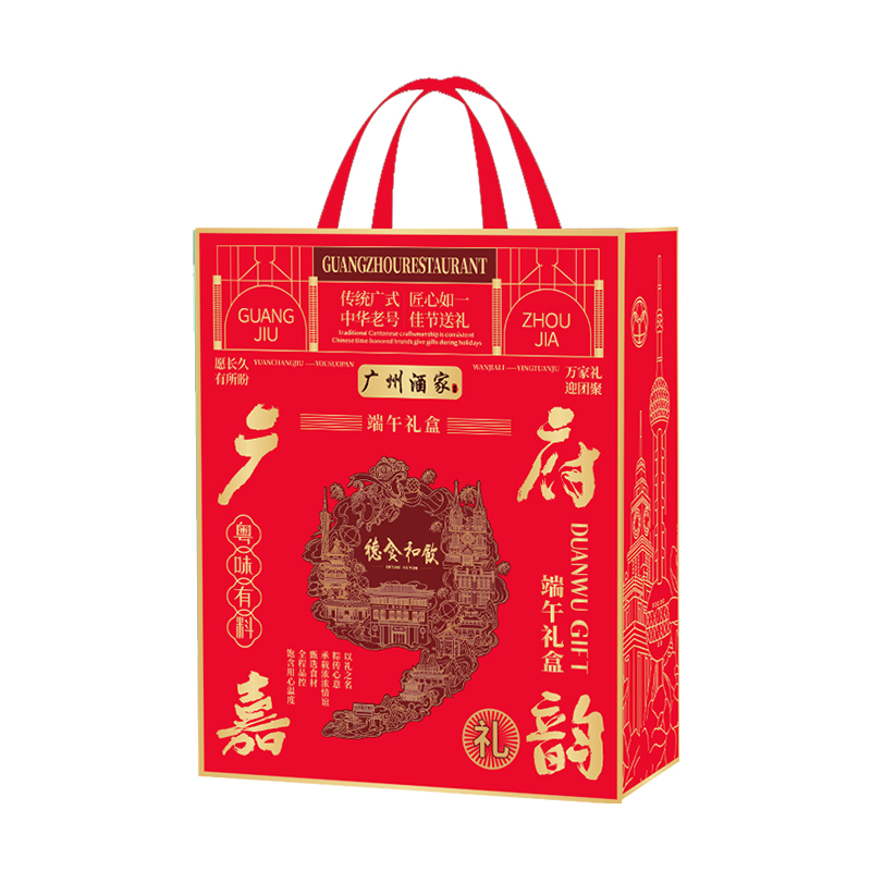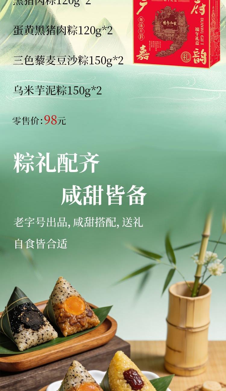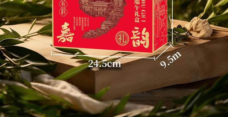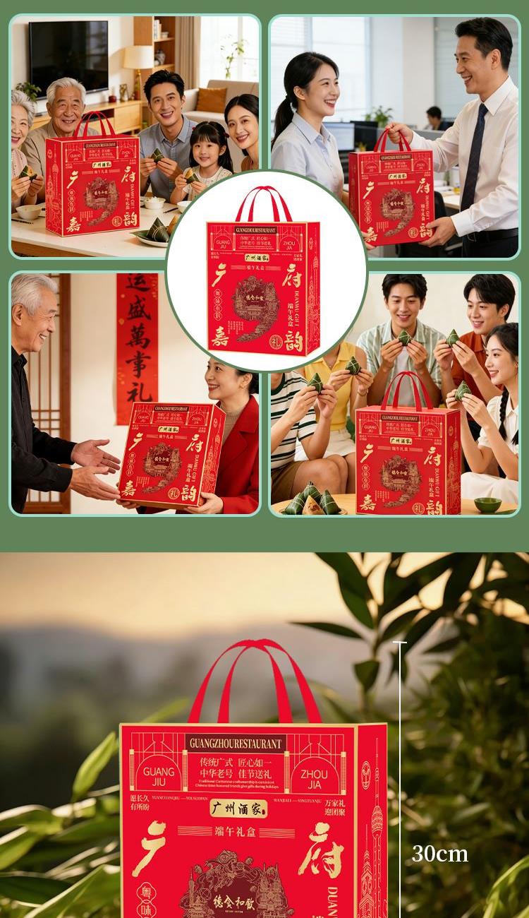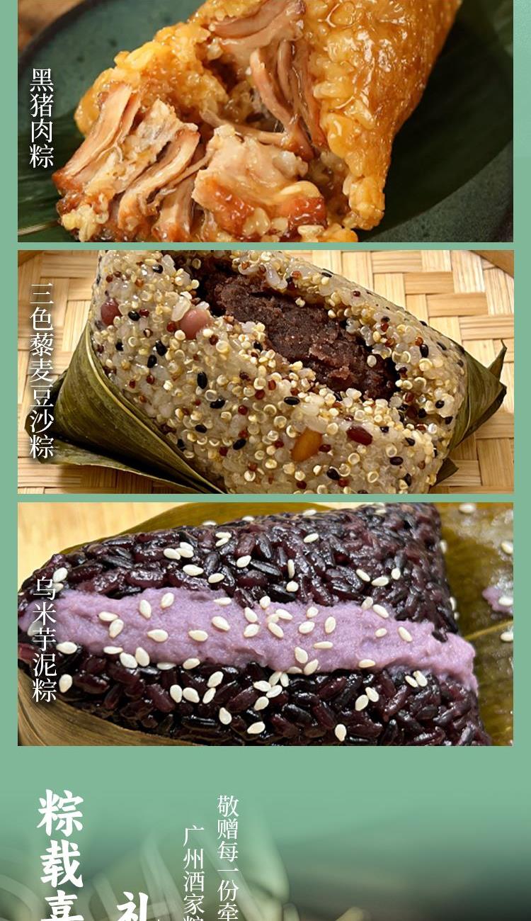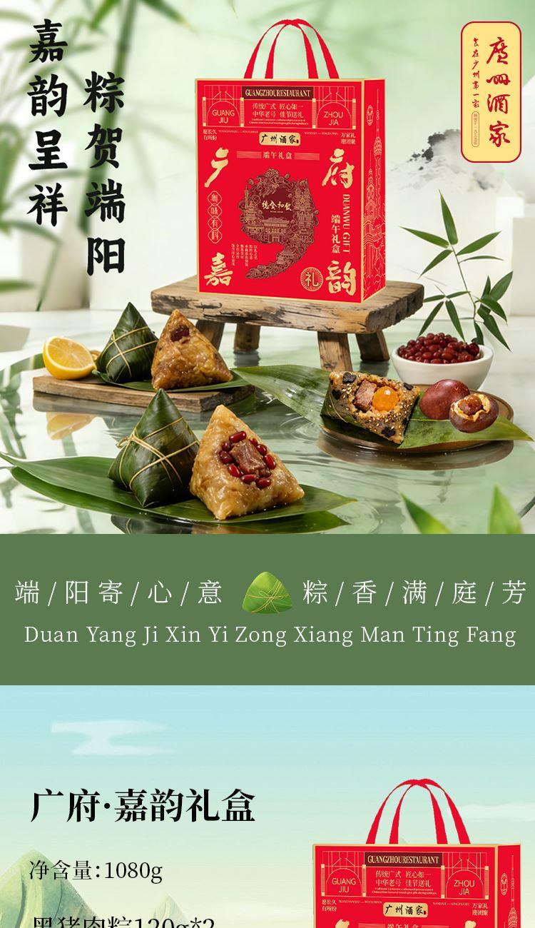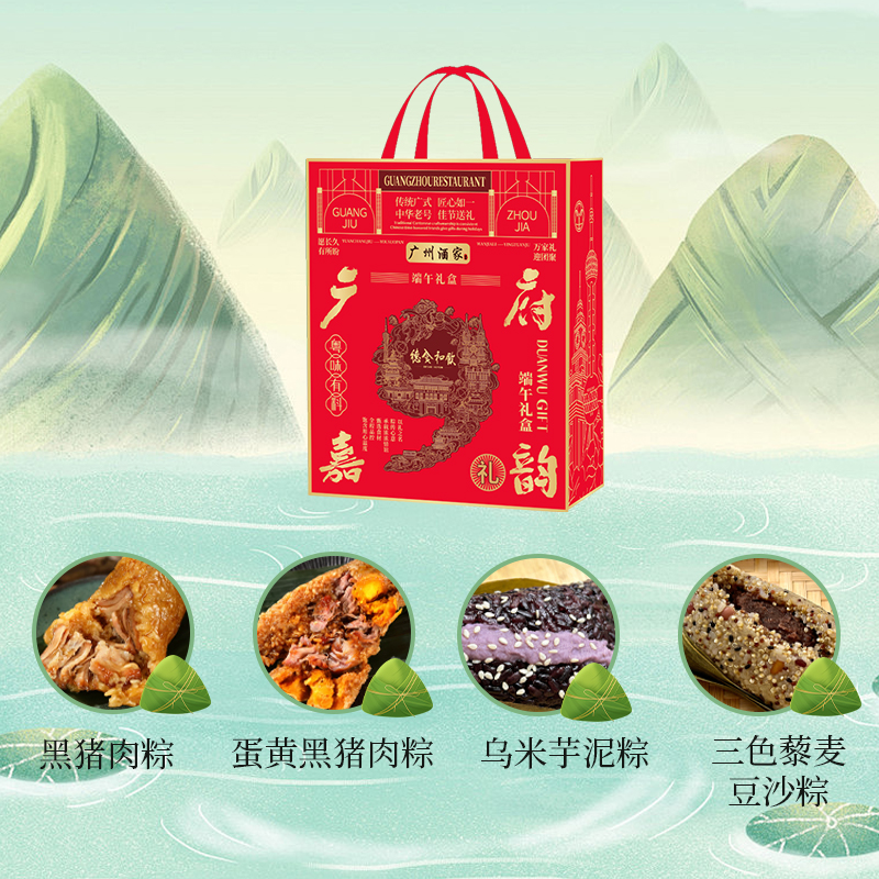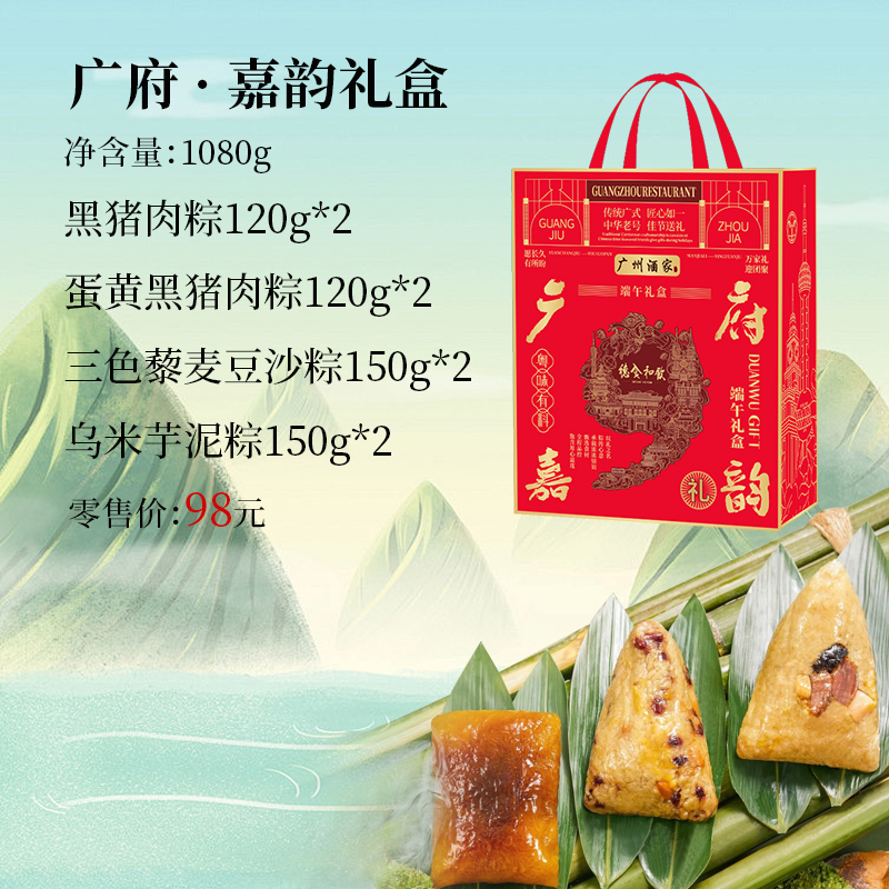 礼盒尺寸:24.5*30*9.5 内容物: 黑猪肉粽120g * 2 蛋黄黑猪肉粽120g * 2 三色藜麦豆沙粽150g * 2 乌米芋泥粽150g * 2 规格:1080g 保质期:9个月 百年广府,地道粤味,广州酒家 非遗匠心,粤菜标杆,国民品质之选 一席岭南风味,四季匠心好礼,认准广州酒家