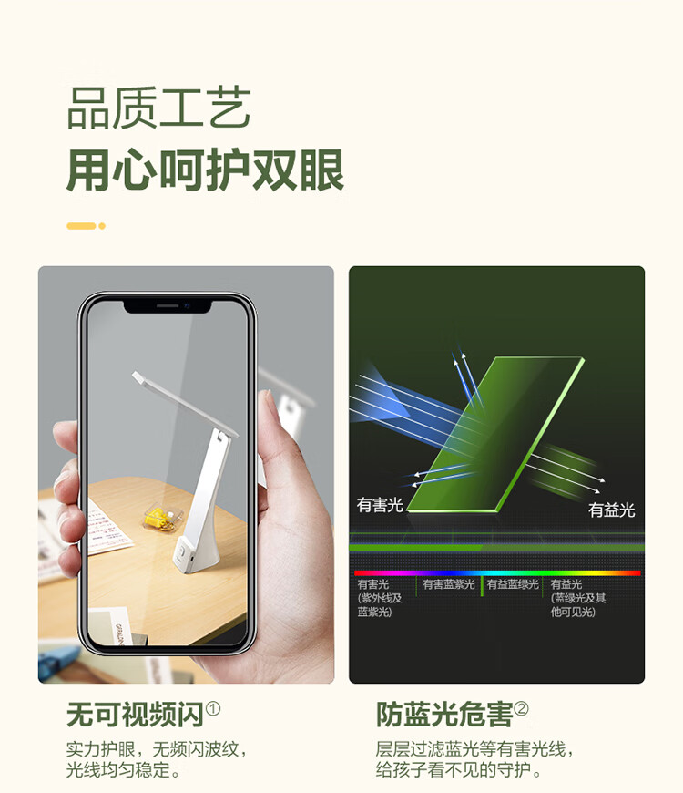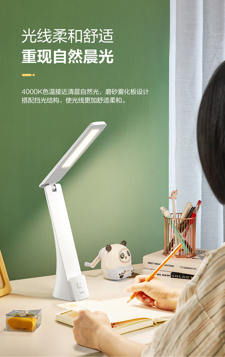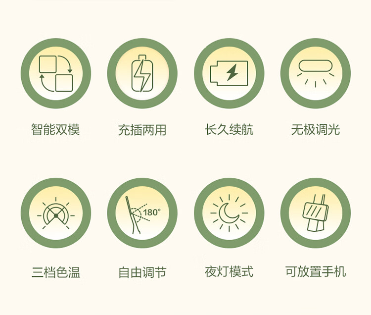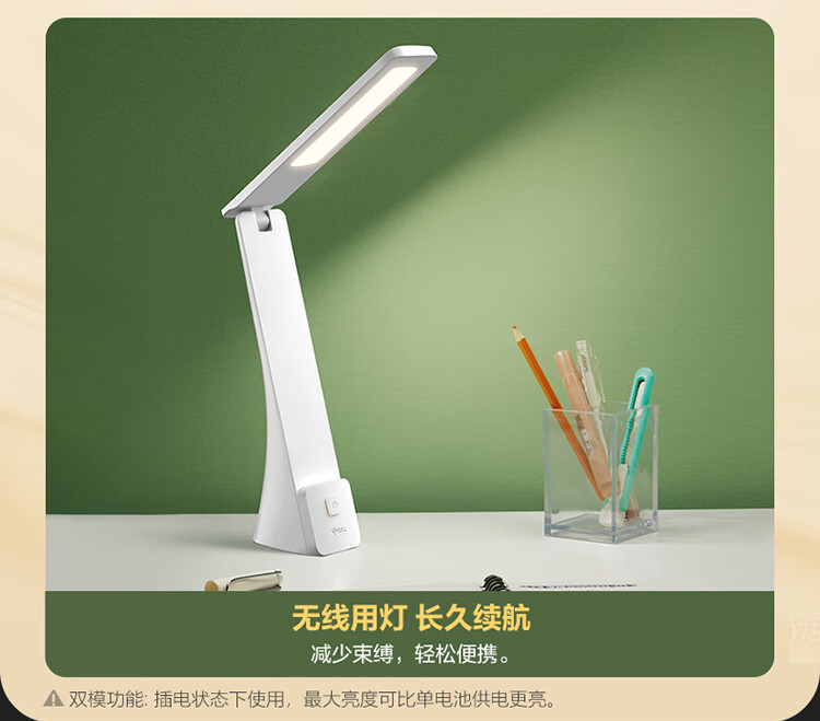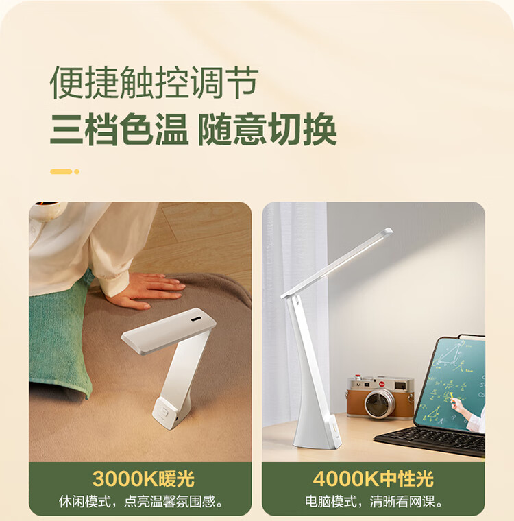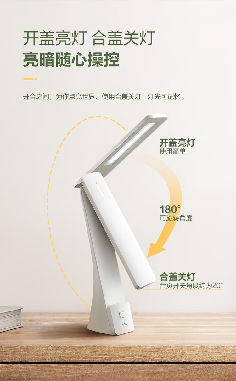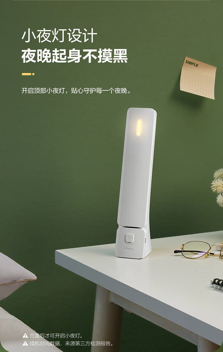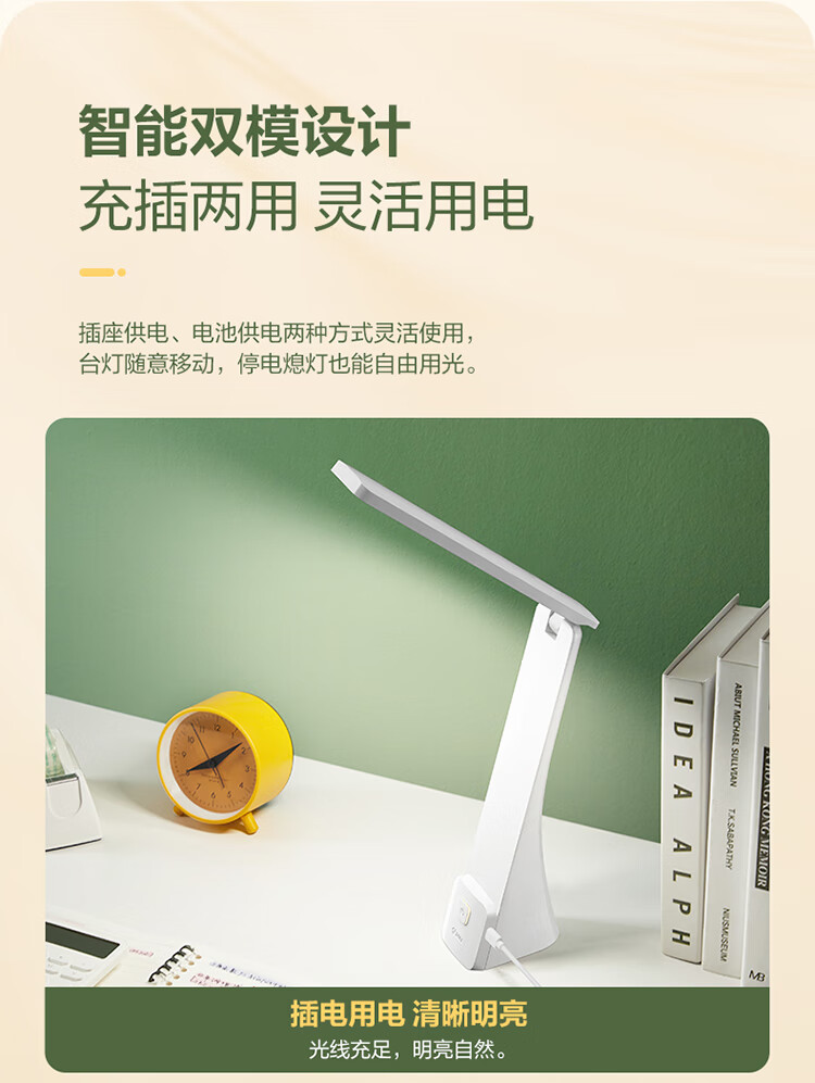 卖点: 1,智能双模设计 充插两用 灵活用电 长效续航 2.满电长可用100小时,持久使用更省心不担心意外停电,影响 学习计划。 3.品质电池 要持久也要安全电池获得CQC安全认证,使用放心。 便捷触控调节,三挡色温 随意切换_x005f开盖亮灯 合盖关灯