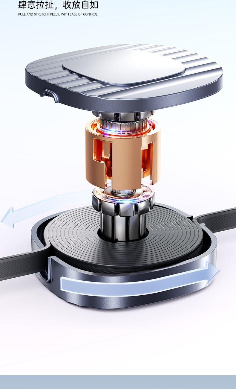 S15清雅100W快充伸缩数据线 颜色:金色 灰色 材质:TPE+ABS 尺寸:1.2M 包装:彩盒包装 【功能特点】: 二拖三伸缩设计,兼容苹果15系列 100W超级快充,充电更快 三种接口满足各种手机 1.2米长度设计,使用方便 TPE材质耐用,商务ABS面盖 五档伸缩调节 可充笔记本电脑