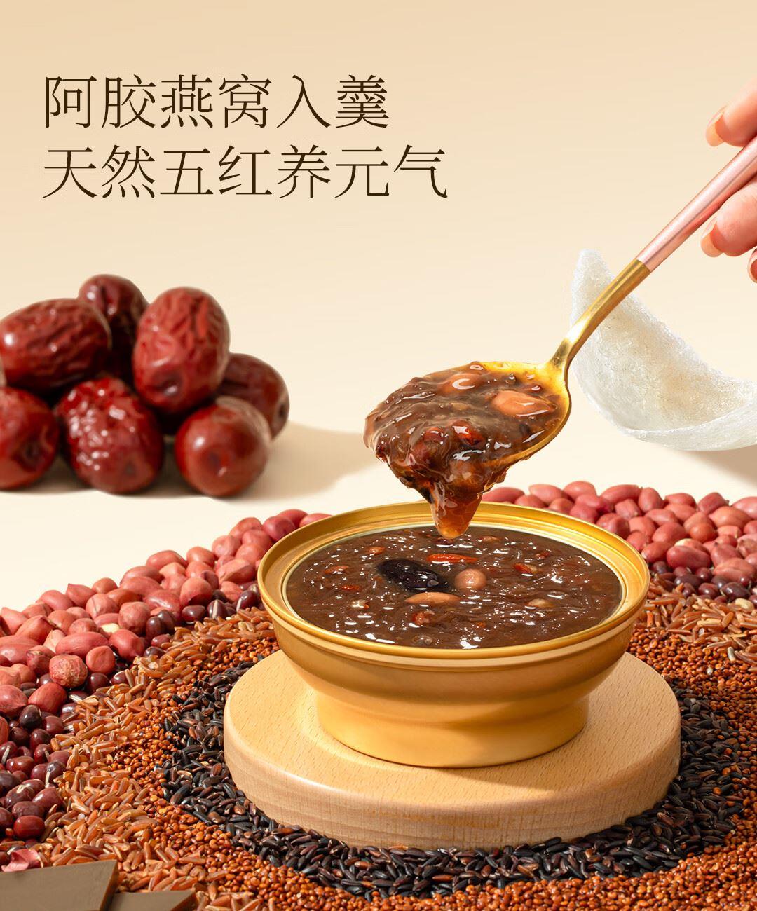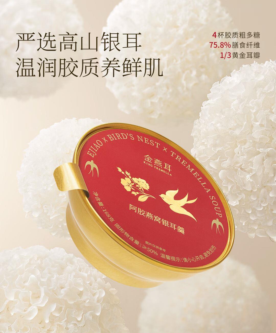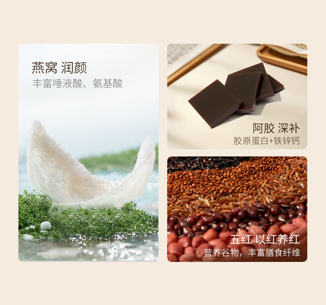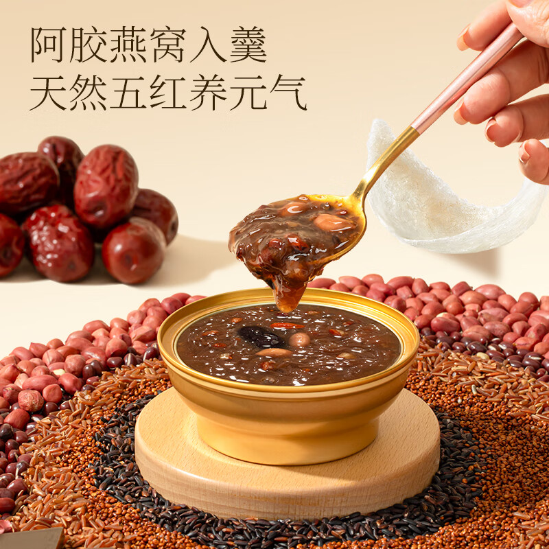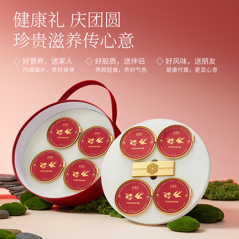 组合配置: 阿胶燕窝银耳羹 168g/碗,8碗/盒(阿胶燕窝) 净含量:1344g 推荐理由: 阿胶补气养血、燕窝滋阴润燥、银耳富含胶质,三重滋养适合东方女性。