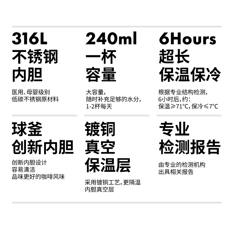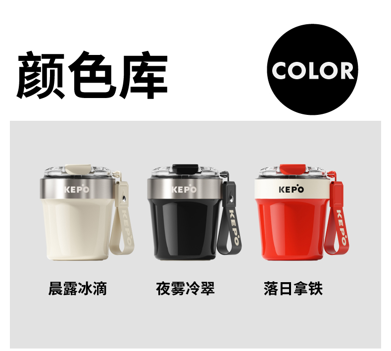 材质:316L不锈钢、硅胶、Tritan 颜色:月光白、曜石黑、热颂红 包装:彩盒 (1)双重防漏,安心放在包包里 (2)大容量,满足一天的饮水量 (3)车载可用设计 (4)圆润把手,便携外带,握持舒适 (5)长效保温、保冷(12H)