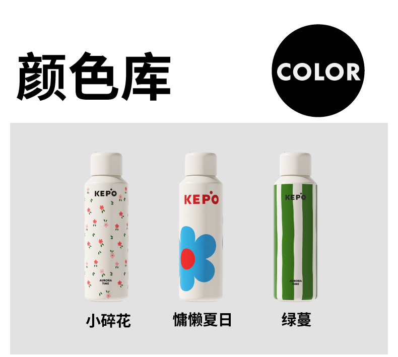 材质:316L不锈钢、硅胶、PP 颜色:慵懒夏日、绿蔓、小碎花 包装:彩盒 (1)无螺纹设计 (2)一键开盖 (3)车载可用设计 (4)花园系列,高颜值设计