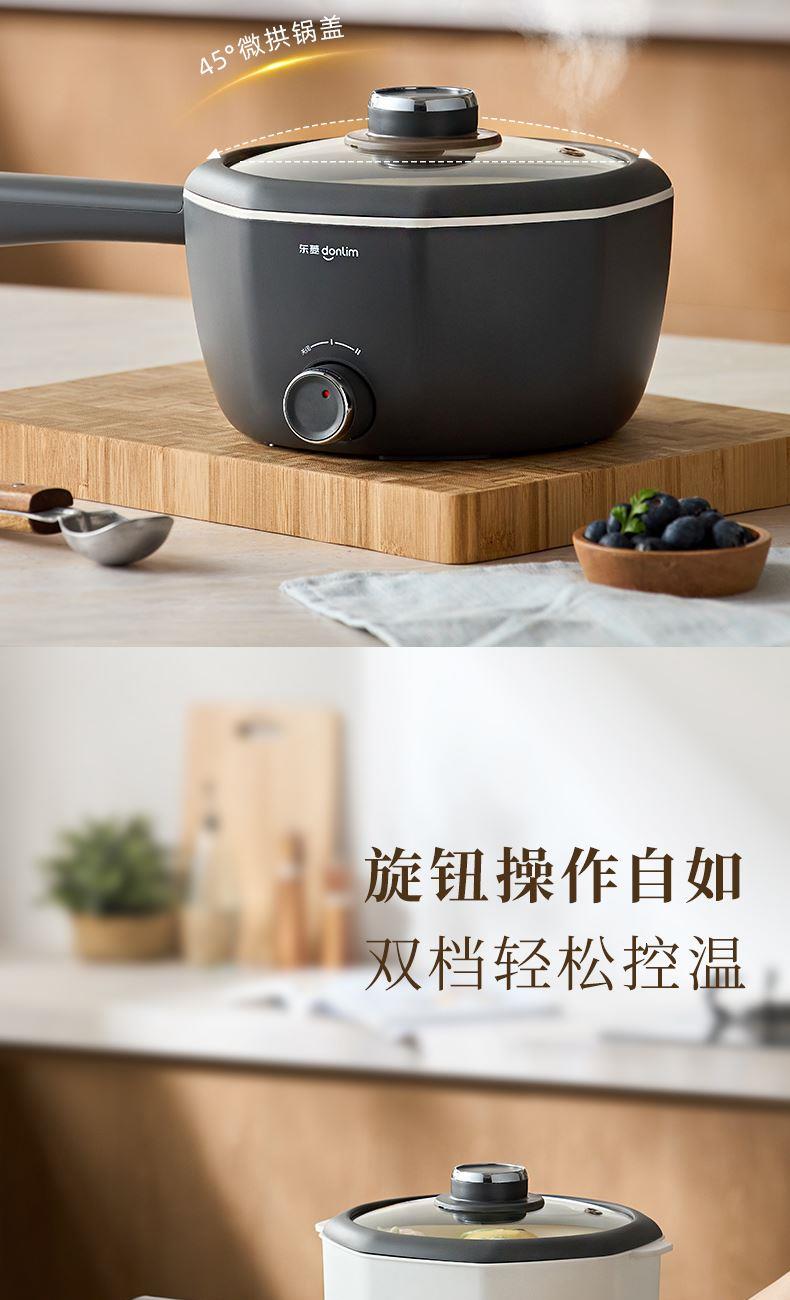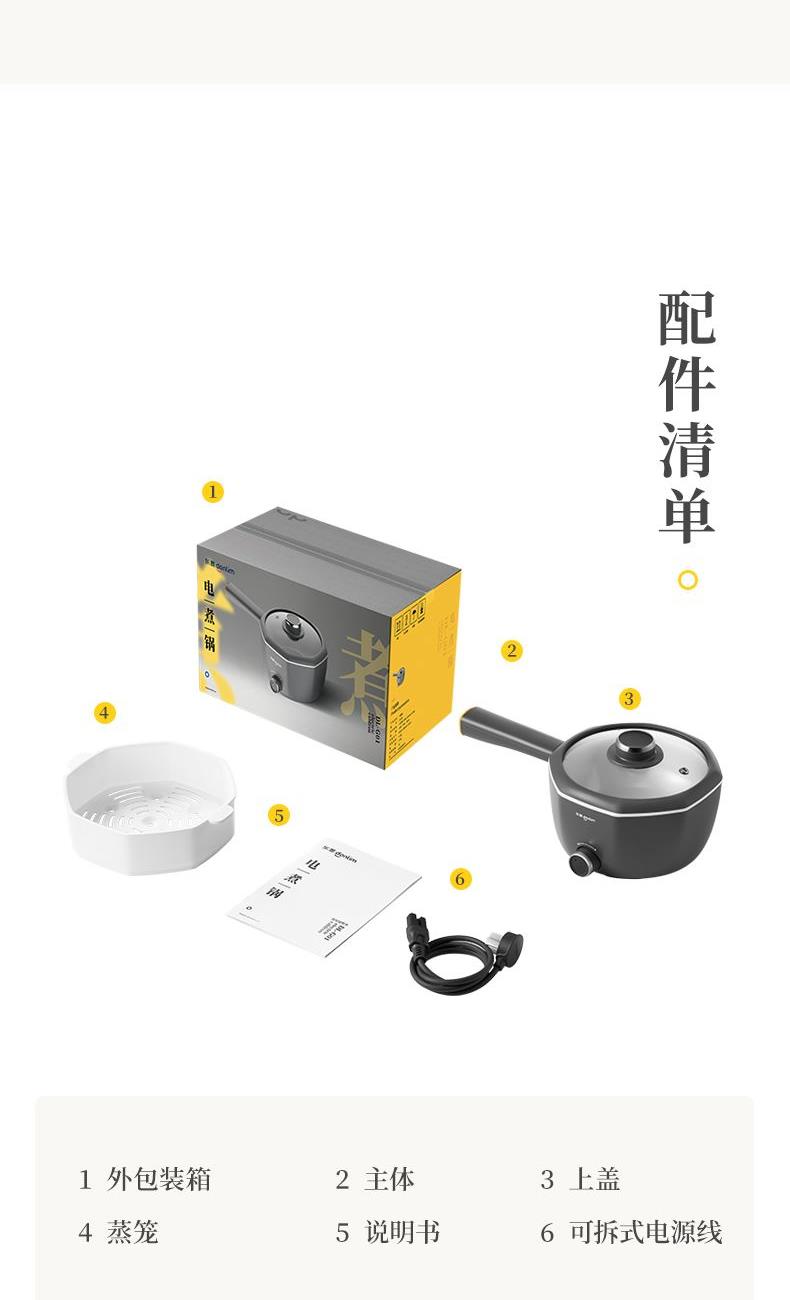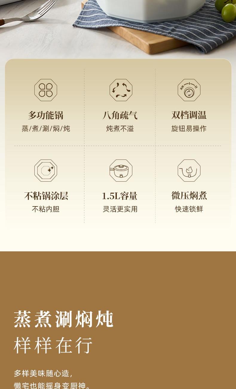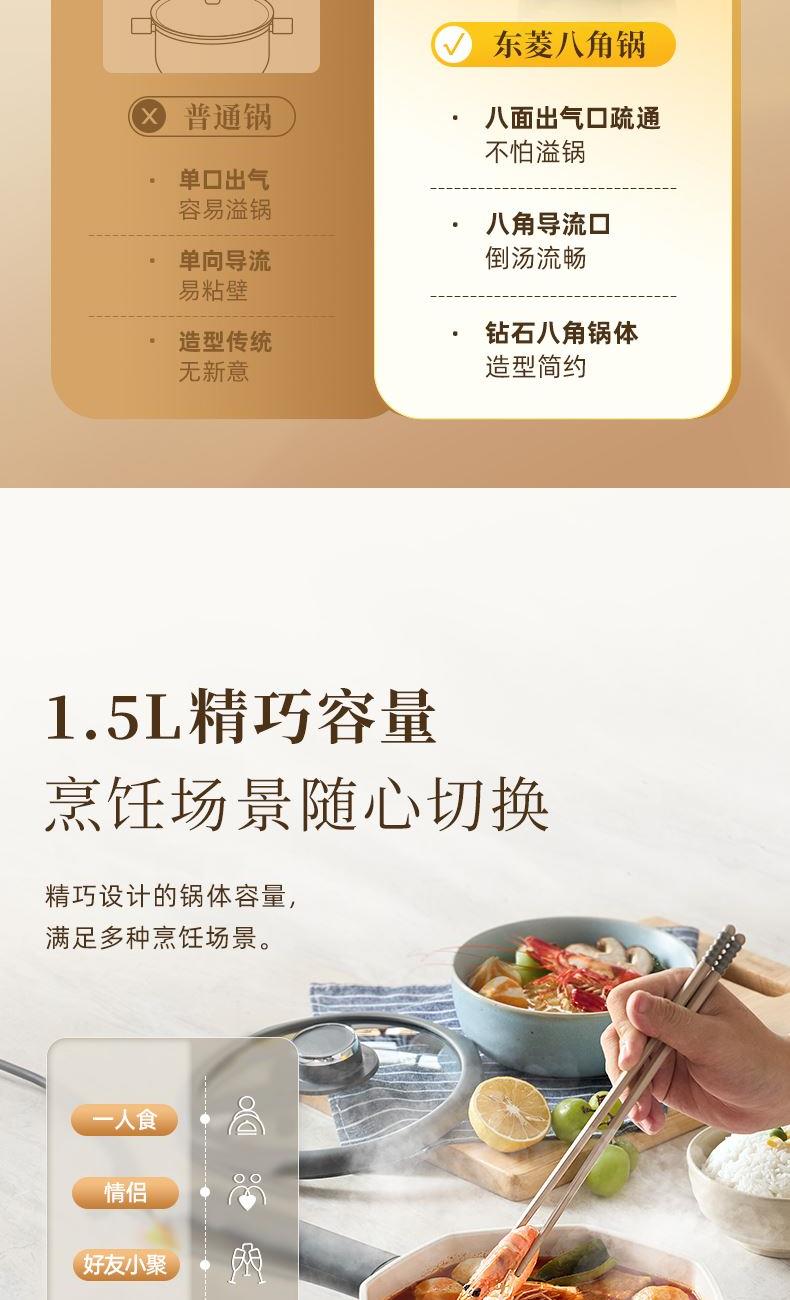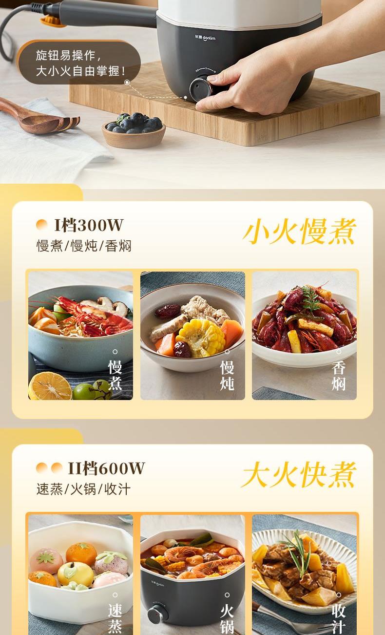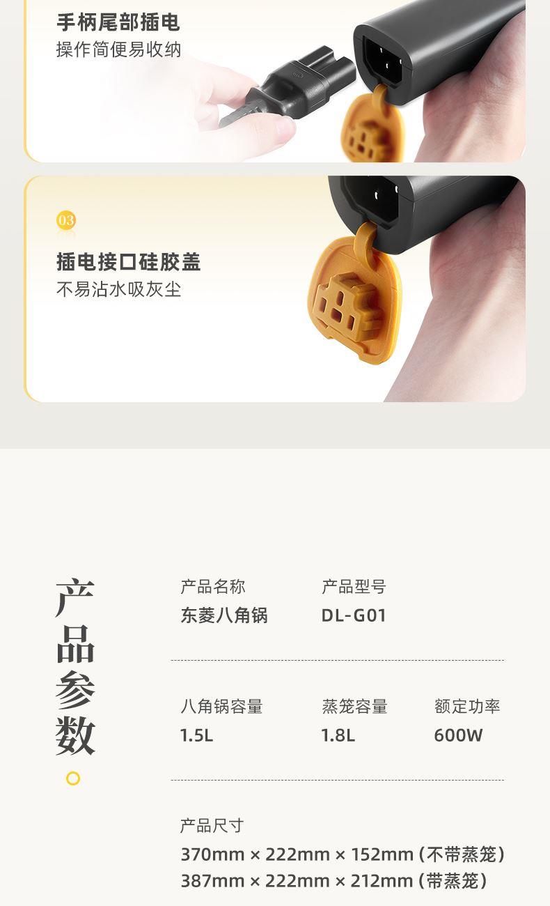 容量:1.5L+1.8L蒸笼 功率:600W 毛重:1.1kg 产品尺寸:387*222*212mm 包装尺寸:418*274*240mm1、45°转盖八角疏气,高汤位不溢 2、食品级内胆,久用不沾 3、长直手柄设计,握持更舒适,高低档功率选择 3、可实现煮、煎、炒、炖、涮、蒸