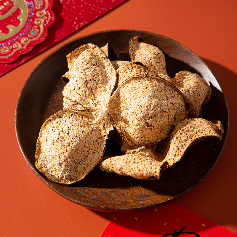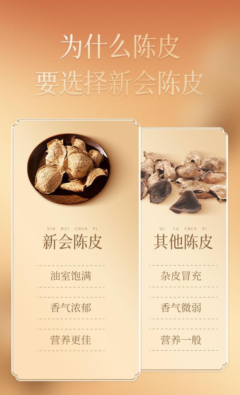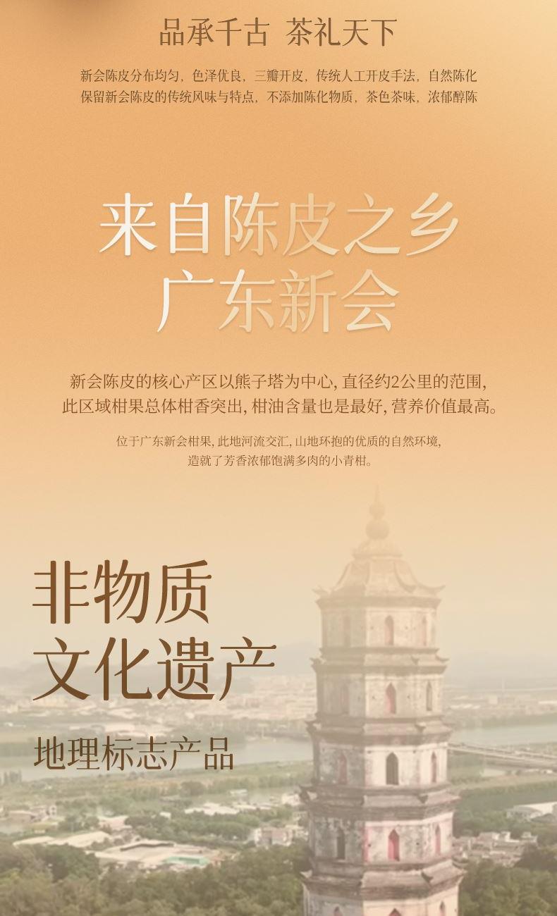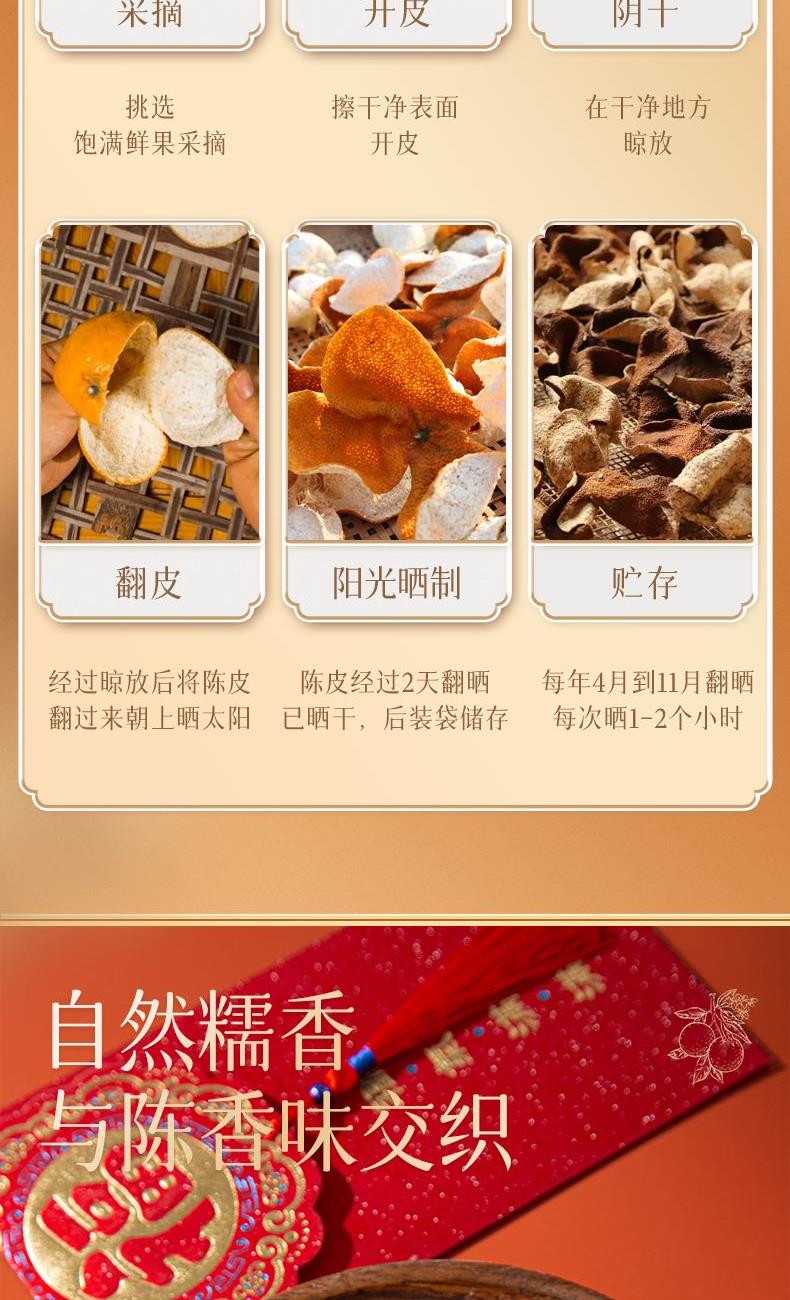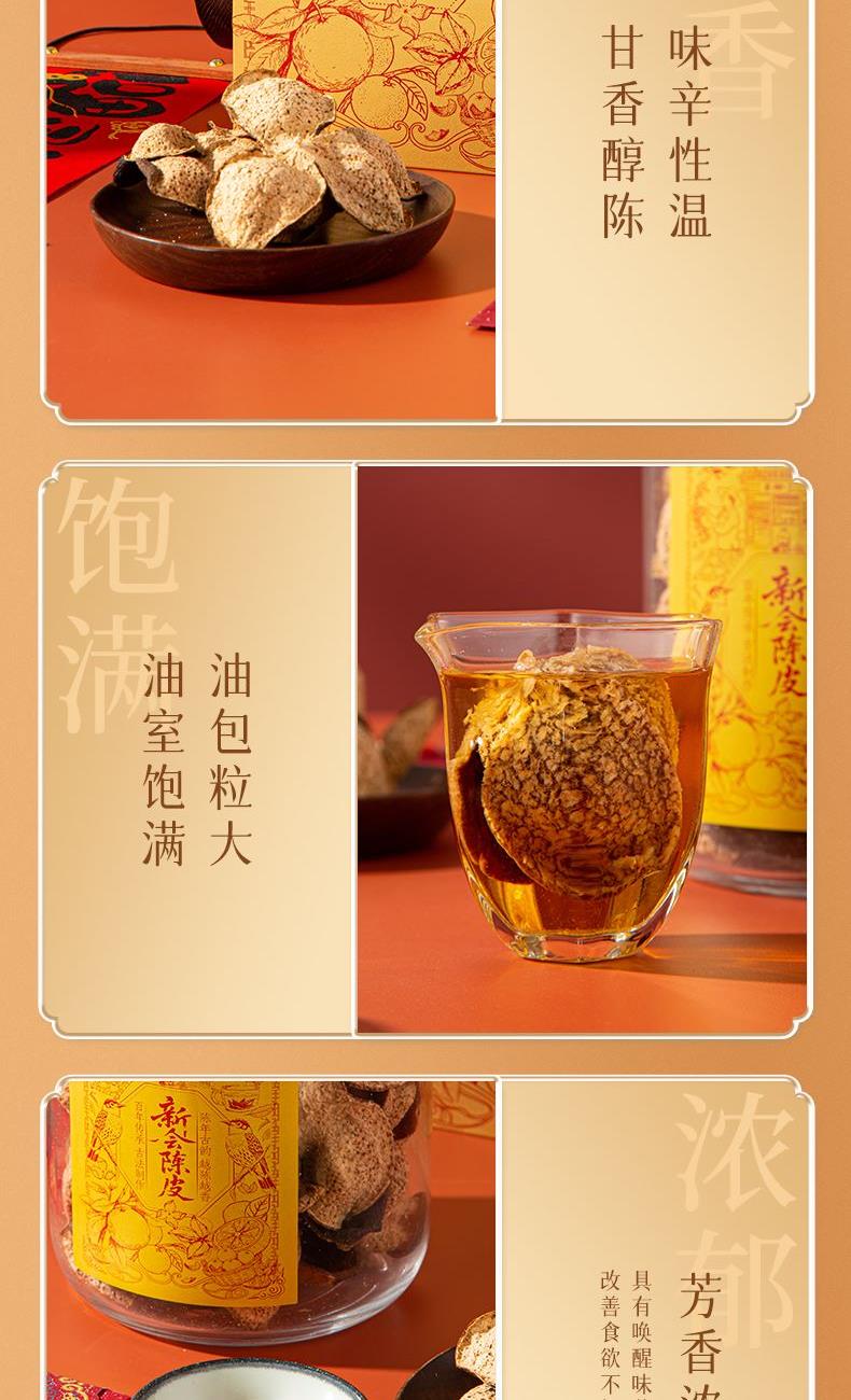 净含量:150g 毛重:1.85kg 产区:广东新会三江产区 原料:新会干仓大红皮 规格:单瓶 1.选用广东新会三江产区陈皮10年陈化原料 2.大红皮采摘于12月,因成熟度高造就口感甜糯,自然糯香味与陈香味交织,老少皆宜。 3.新会陈皮味辛性温,甘香醇陈,油包粒大,油室饱满,芳香浓郁,具有唤醒味蕾,改善食欲不振,消滞健胃。 4.新会陈皮不仅能单独泡茶,还可以用来与其他茶叶搭配冲泡,白茶,红茶,普洱等。