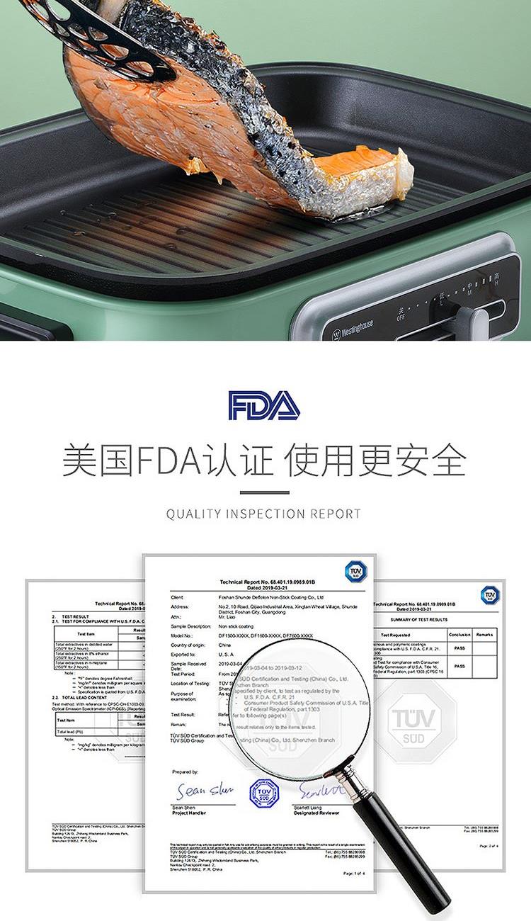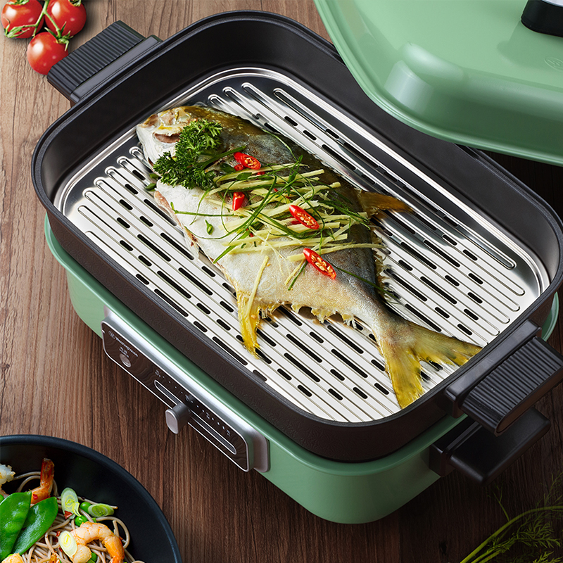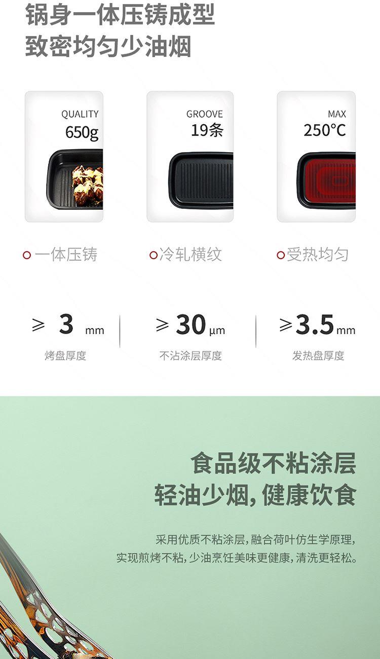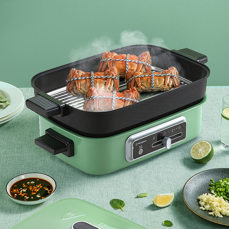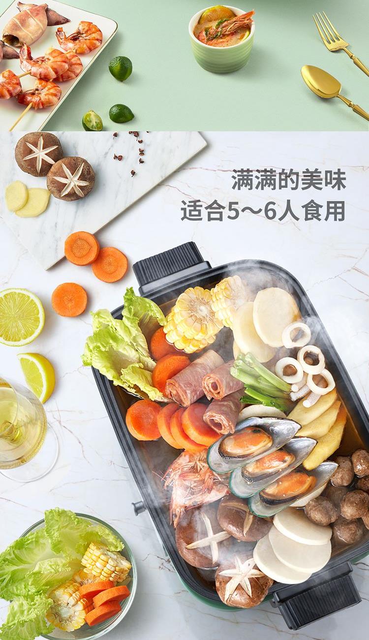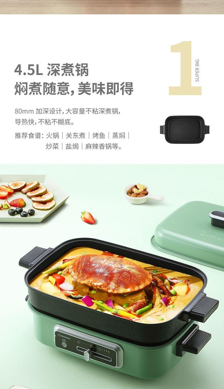 产品规格: 1、产品容量:4.5L 2、额定电压:220V 3、额定频率:50Hz 4、额定功率:1400W 产品特点: 1、面板式一体压铸发热盘 整体受热无死角 2、推杆式温控 火候尽在掌握 3、煎.烤、烙.炖.煮.蒸.焖样样精通,做有才艺的百变料理锅 4、4.5L深煮锅 焖煮随意,美味即得 5、食品级蒸格 蒸出生活鲜甜味 6、食品级不粘涂层 轻油少烟,健康饮食