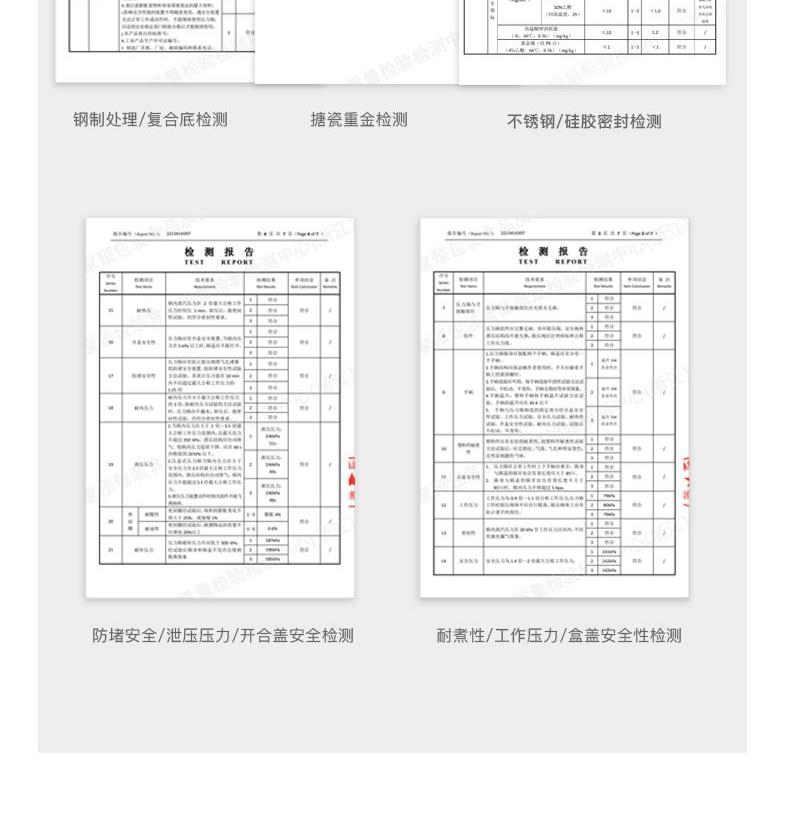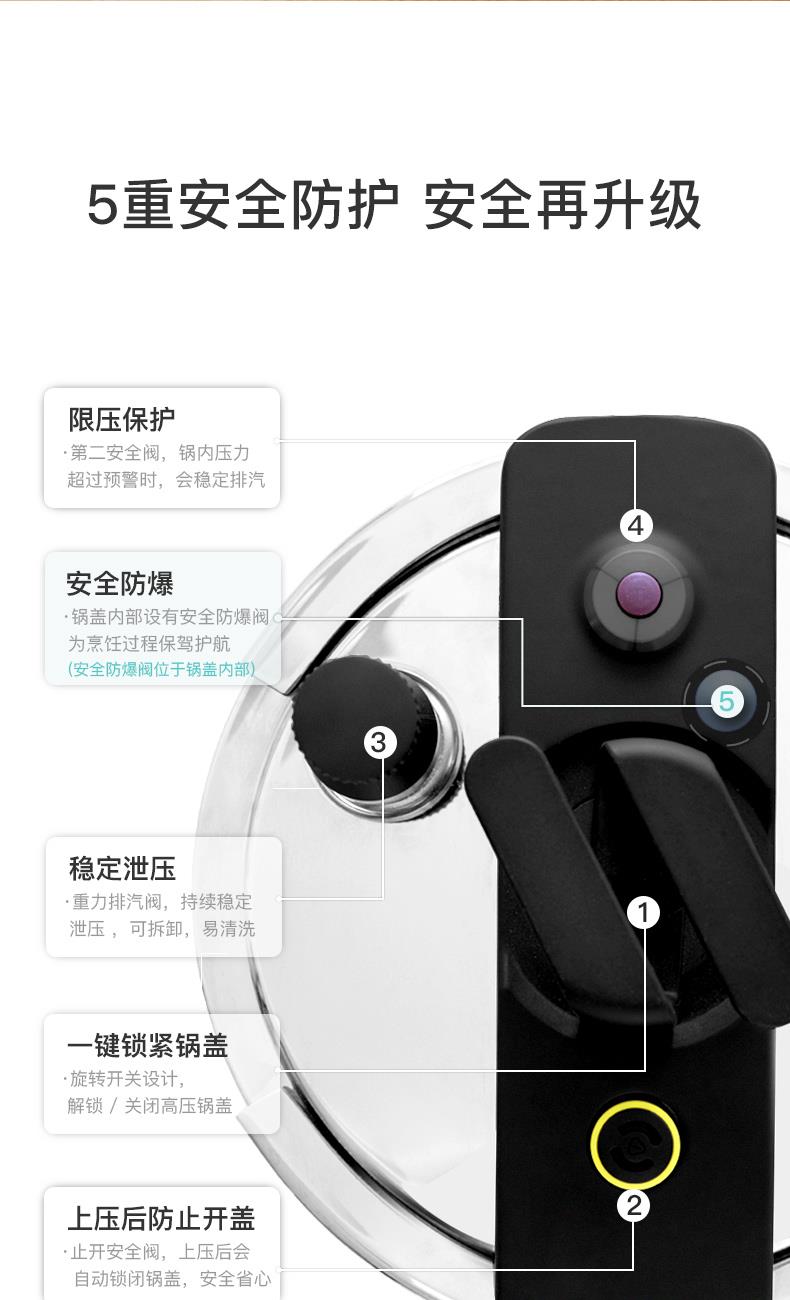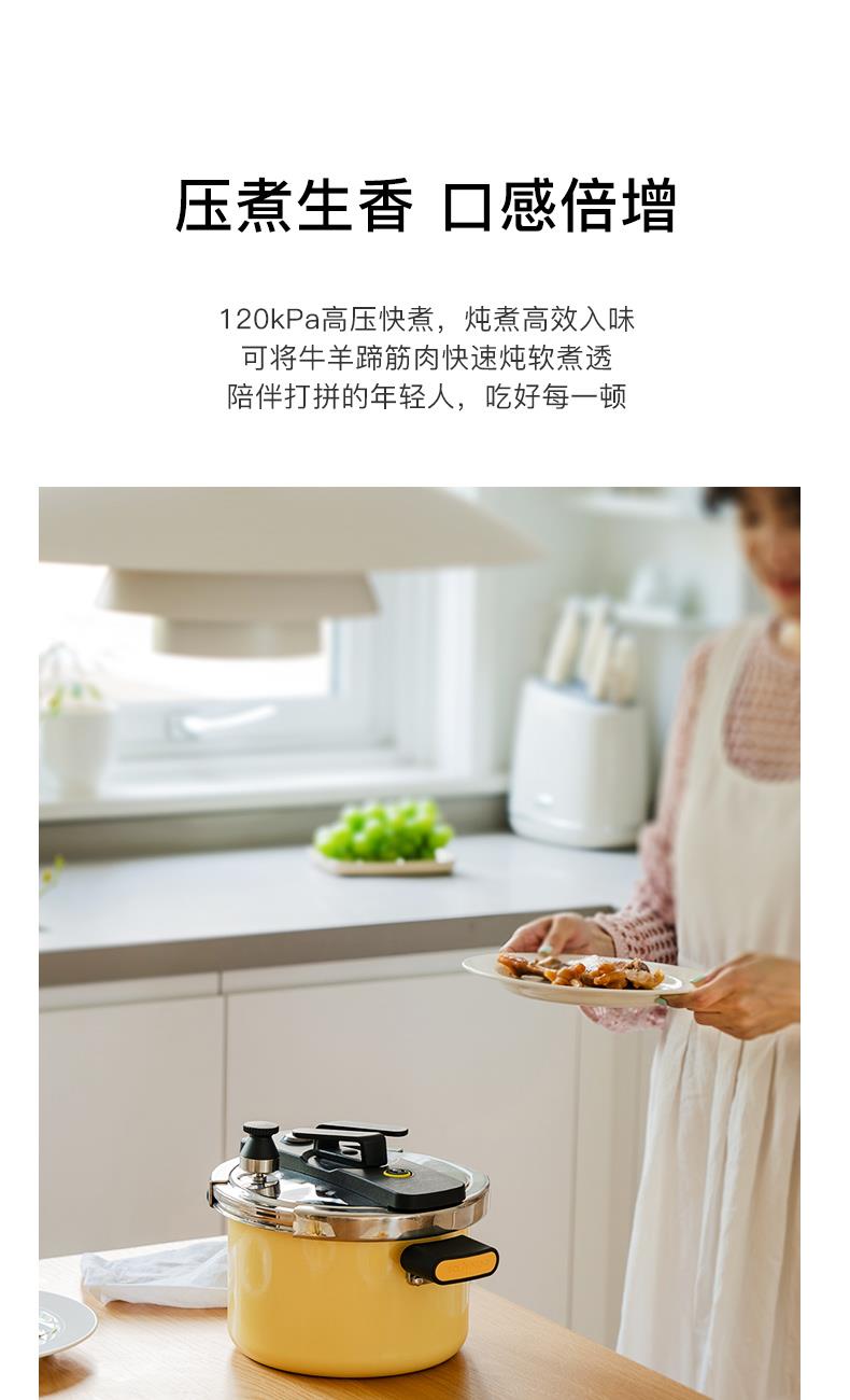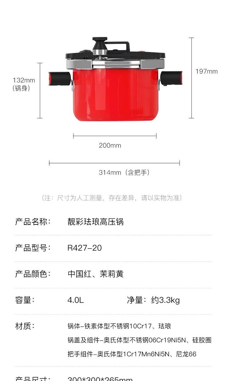 产品容量:4.0L 产品材质:10Cr17不锈钢、珐琅、06Cr19Ni5N、 1Cr17Mn6Ni5N、硅橡胶、尼龙、 产品颜色:中国红、茉莉黄 1、120kpa的压力,旋转开关设计,省时省力,轻松掌握使用超简单; 2、一锅双盖,高压烹饪硬菜,玻璃锅盖日常料理,一锅多用 尼龙耐高温把手,高颜值硬实力,不怕烈火炙烤; 3、430不锈钢锅体,可用于煤气灶、电磁炉、电陶炉的烹饪; 5、德国进口珐琅釉彩涂装,耐腐蚀抗酸碱,保持食物原始风味; 6、四重840℃高温窑炉烧制, 坚固耐用,久烧不黑 ,靓彩永不褪色。