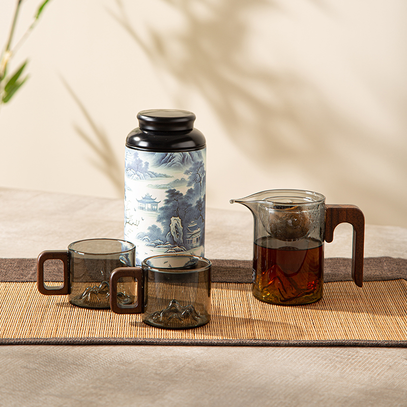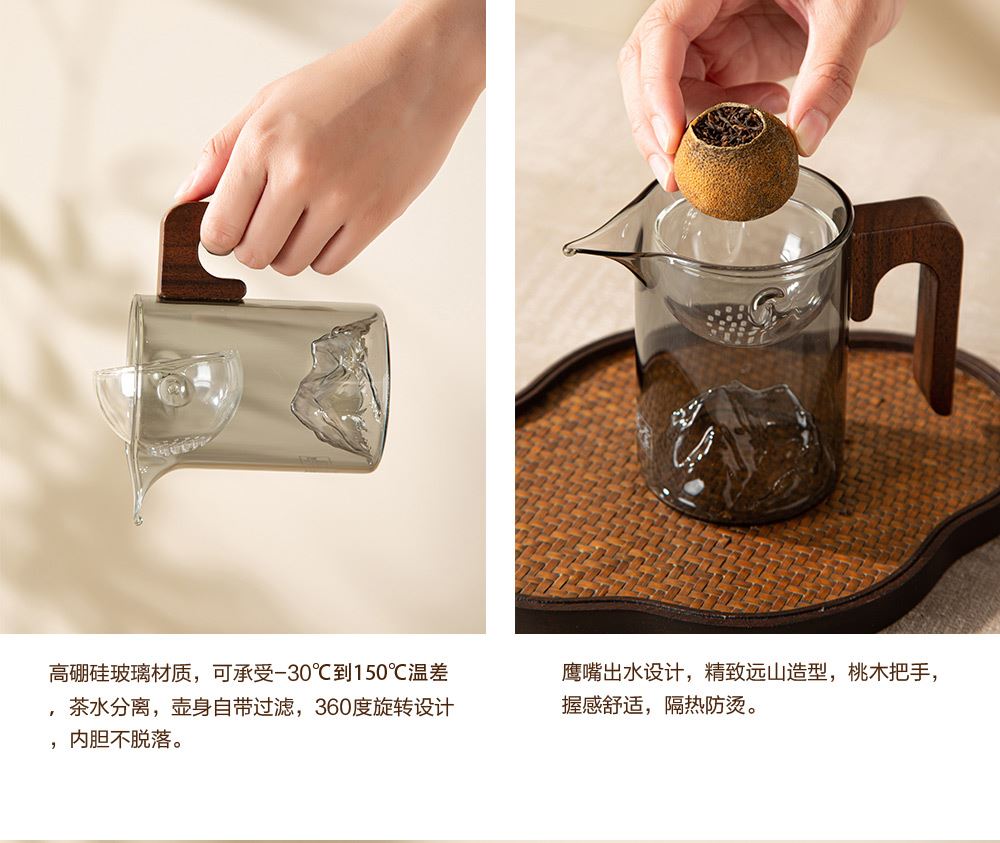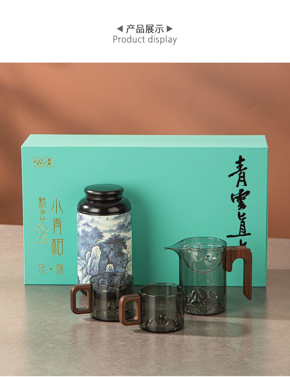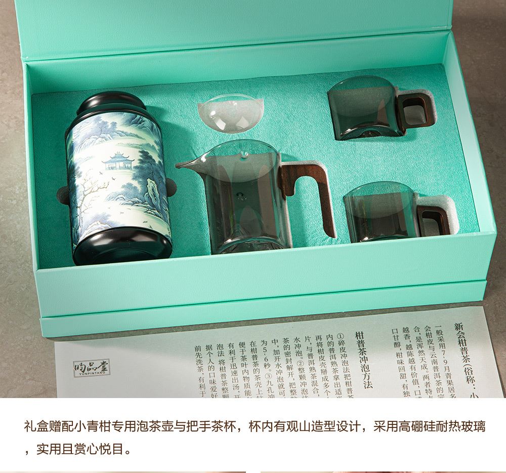 6.礼盒赠配小青柑专用泡茶壶与把手茶杯,杯内有观山造型设计,采用高硼硅耐热玻璃,实用且赏心悦目。
