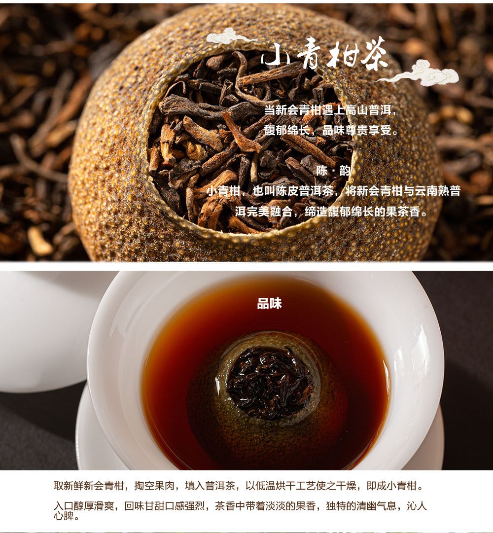 3.新会小青柑性温,甘香醇陈,油包清晰,油室饱满,芳香浓郁,具有唤醒味蕾,改善食欲不振,消滞健胃。