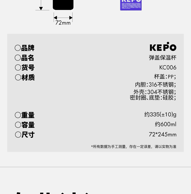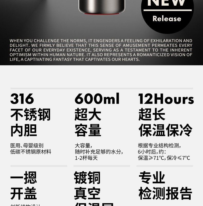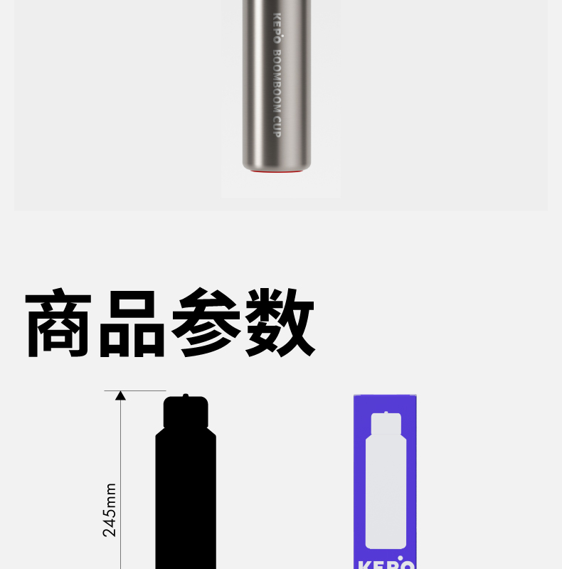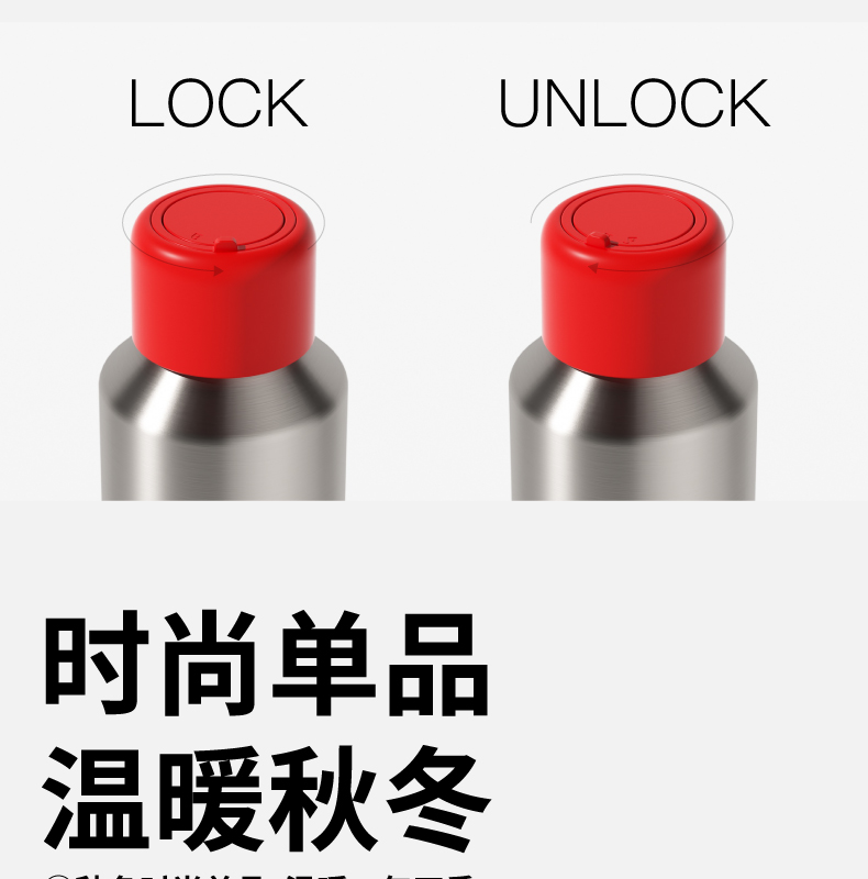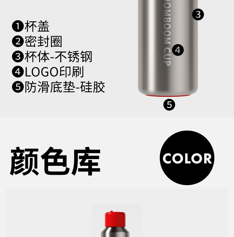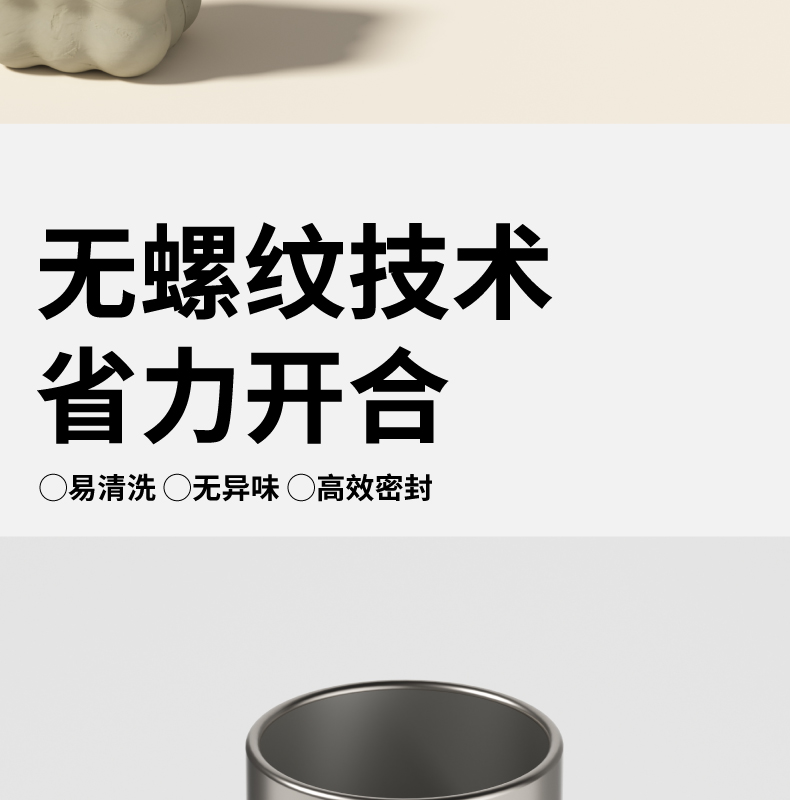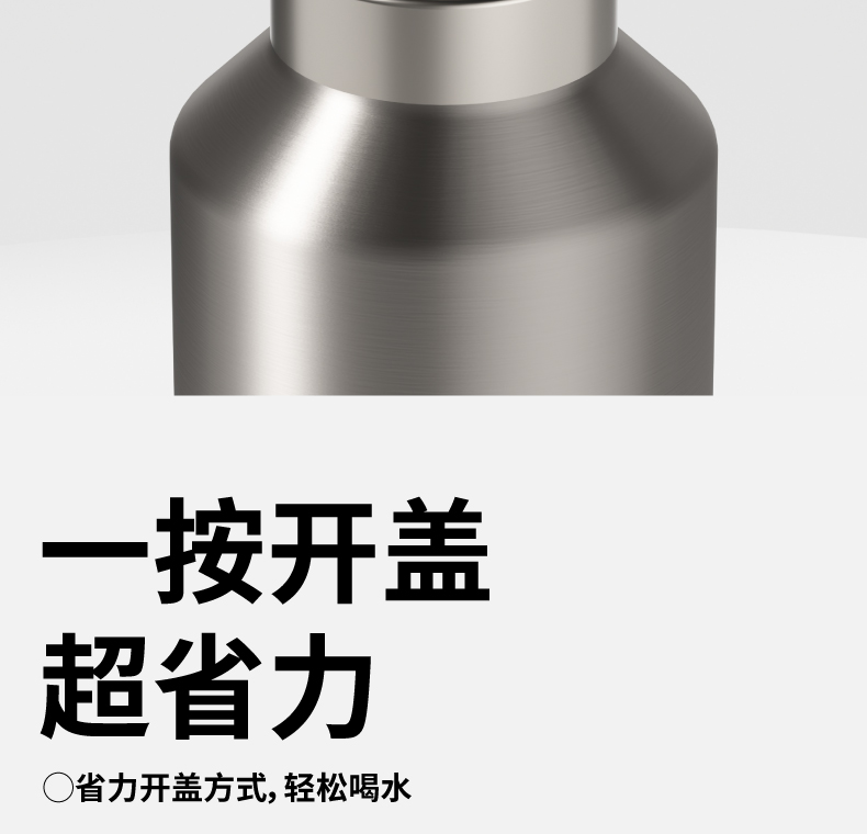 材质:316L不锈钢、硅胶、PP 颜色:磨砂灰 包装:彩盒 (1)无螺纹设计 (2)一键开盖 (3)车载可用设计 (4)潮酷