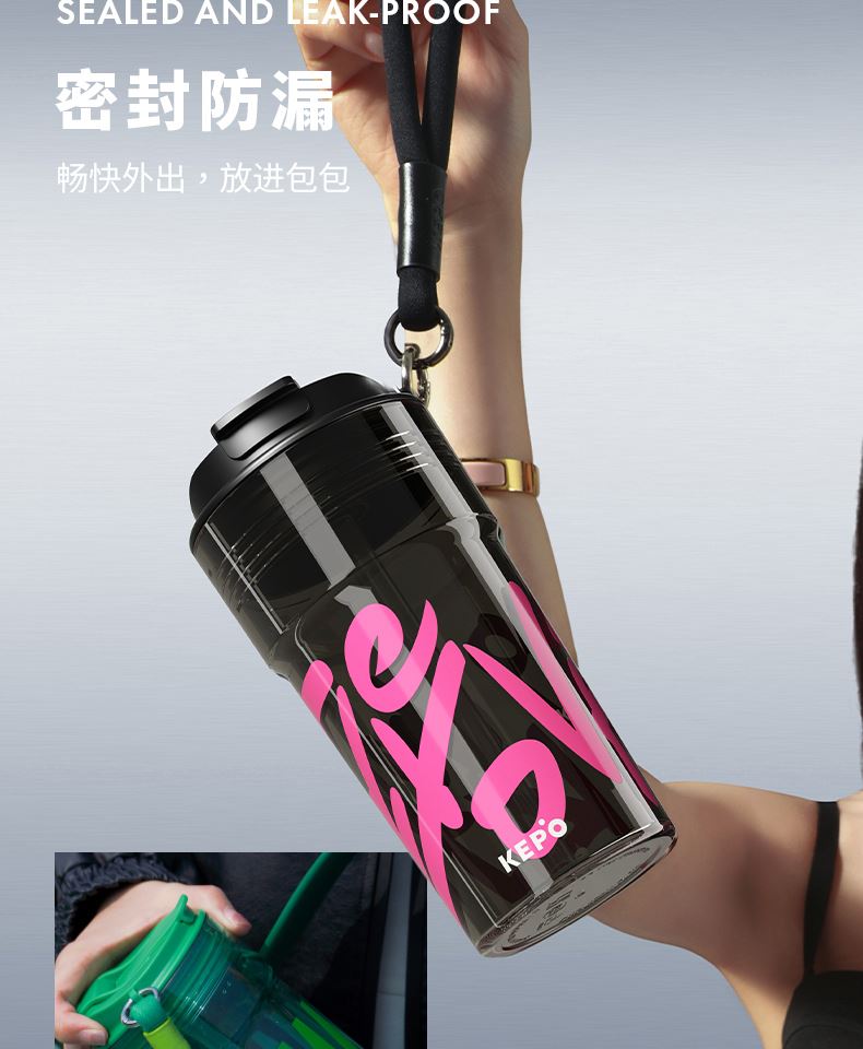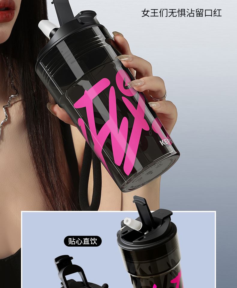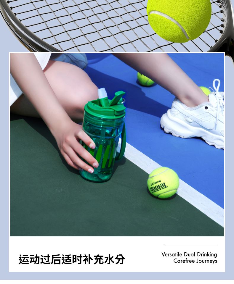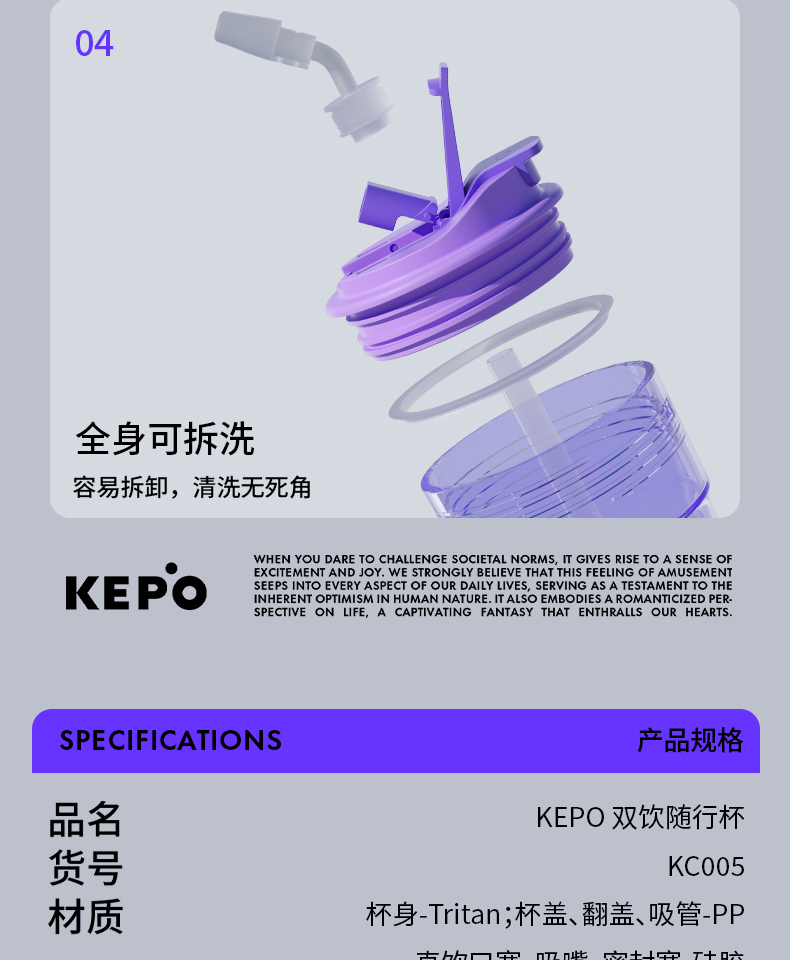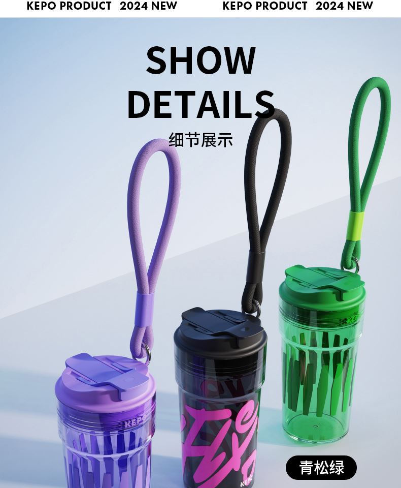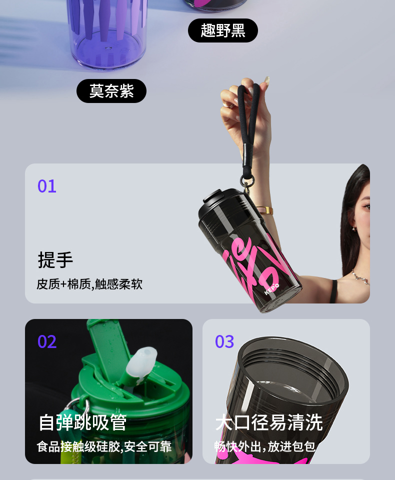 材质:Tritan、PP、硅胶 颜色:黑色、紫色、绿色 包装:彩盒 (1)吸管引用、直饮,两种方式合二为一 (2)Tritan材质,安全可靠 (3)车载可用设计