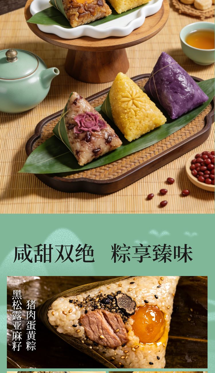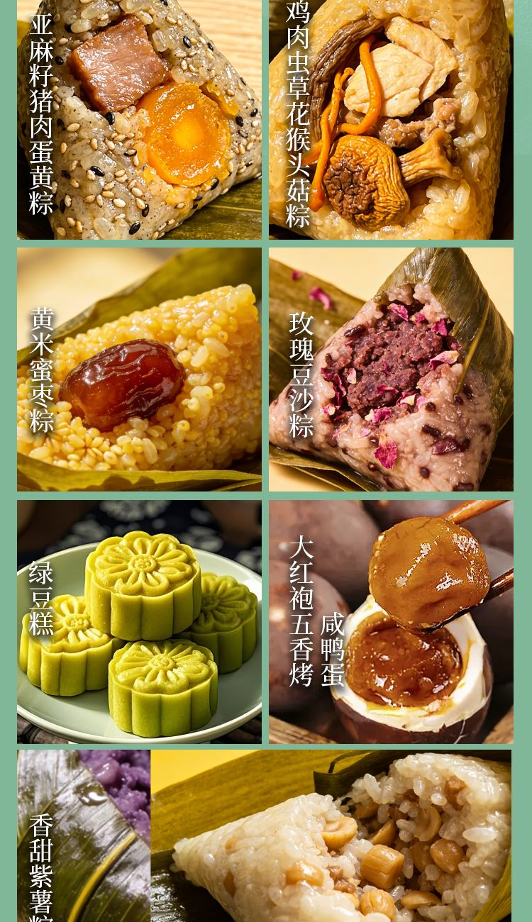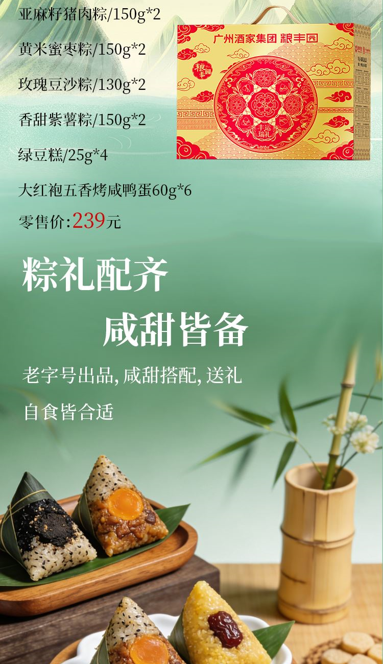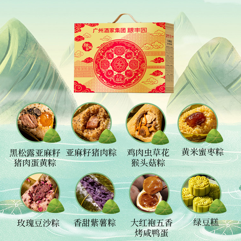 礼盒尺寸:38*31*13 内容物: 黑松露亚麻籽猪肉蛋黄粽/130g * 2 亚麻籽猪肉粽/150g * 2 鸡肉虫草花猴头菇粽/120g * 2 黄米蜜枣粽/150g * 2 玫瑰豆沙粽/130g * 2 香甜紫薯粽/150g * 2 绿豆糕/25g * 4 大红袍五香烤咸鸭蛋60g * 6 规格:2120g 保质期:6个月 百年广府,地道粤味,广州酒家 非遗匠心,粤菜标杆,国民品质之选 一席岭南风味,四季匠心好礼,认准广州酒家