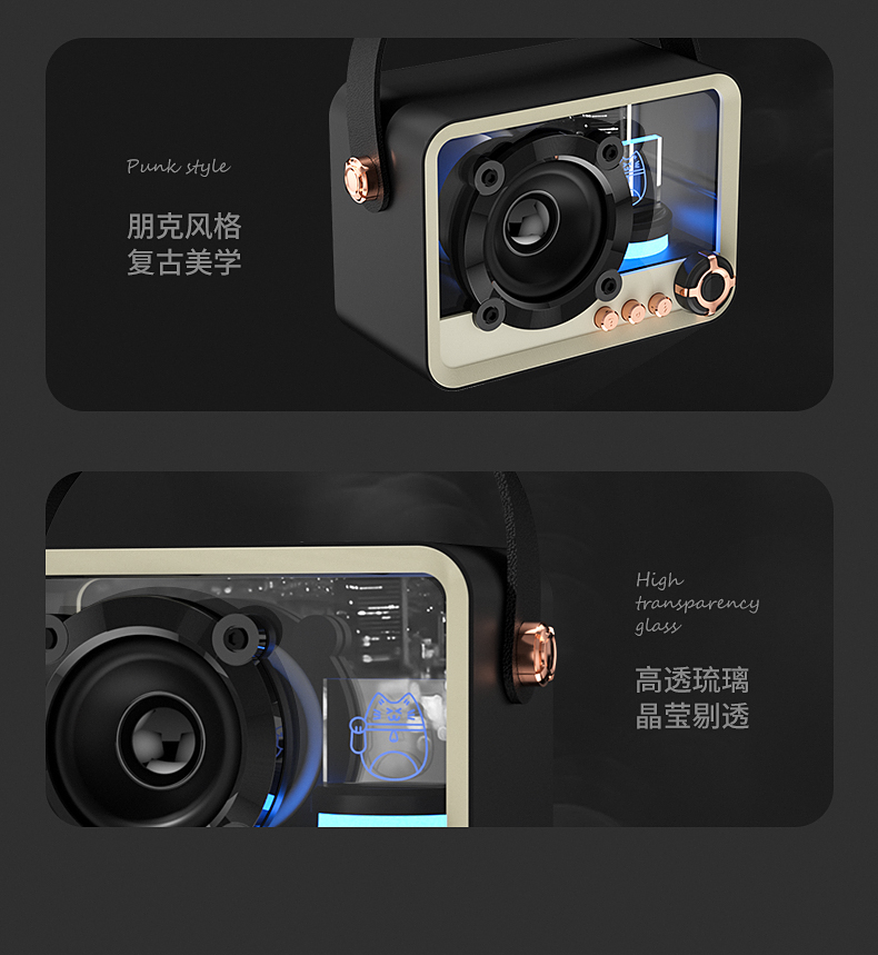 招财猫便携蓝牙音响QD05 颜色:白色 黑色 材质:ABS+PC 尺寸:105*76*55mm 包装:彩盒包装 【功能特点】: 发光招财猫片,客户可定制发光logo 经典旋钮控制音量大小 蓝牙连接/插卡播放/USB播放/音频线 5.4蓝牙芯片连接稳定