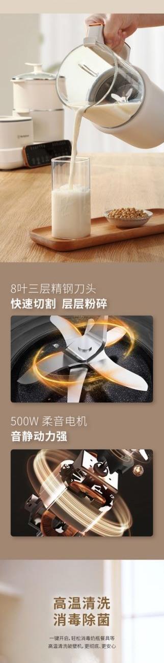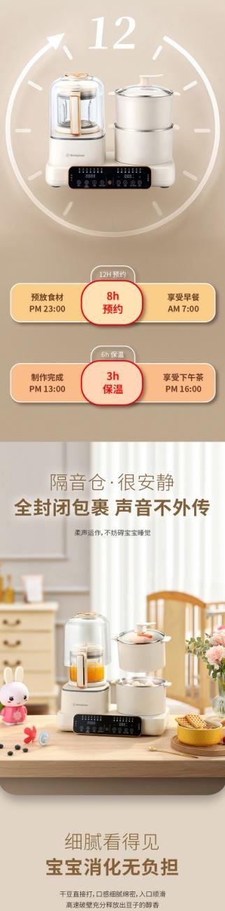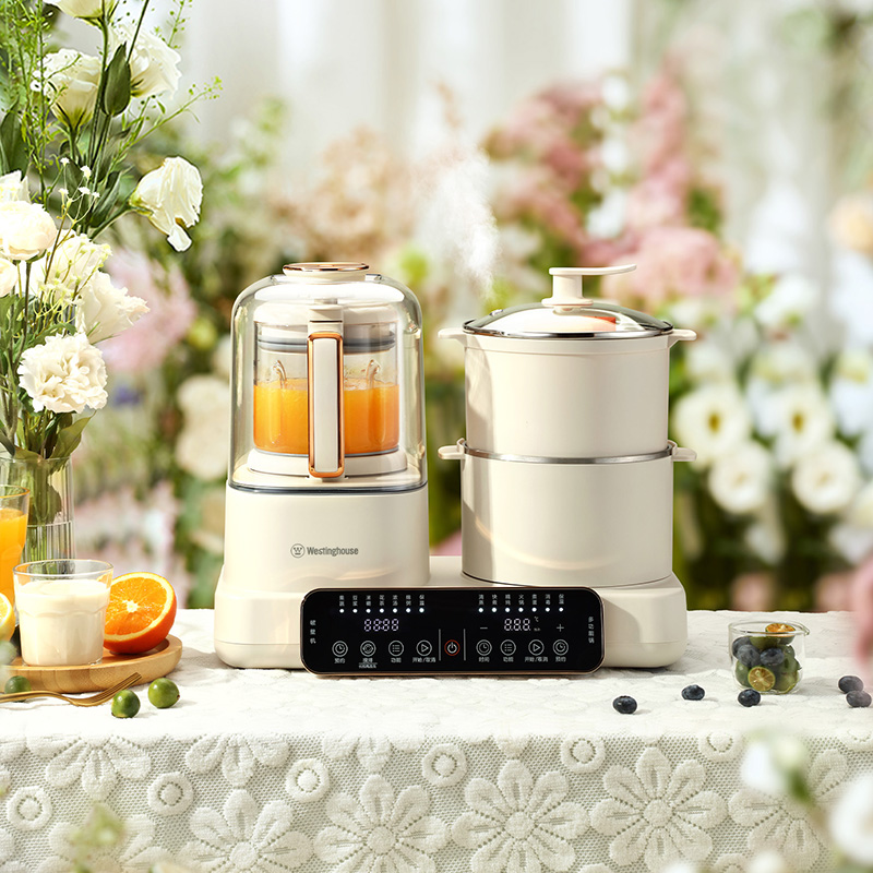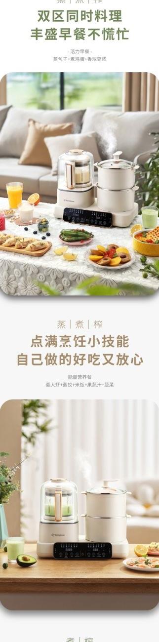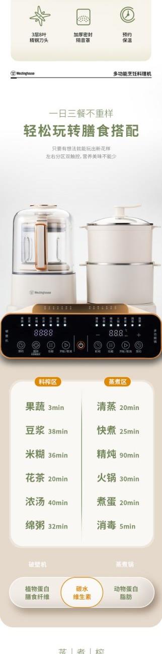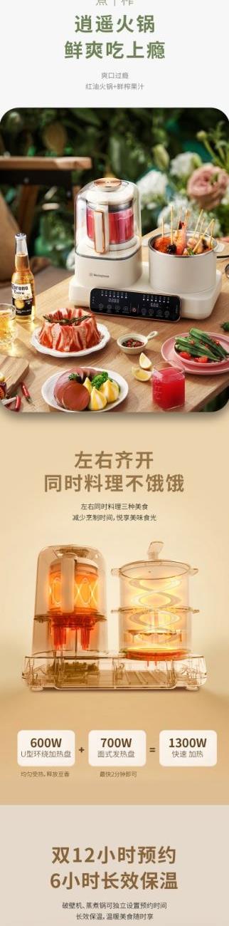 产品规格: 1、额定电压:220V~50Hz 2、破壁机加热功率:600W 3、破壁机搅拌功率:500W 4、多功能锅加热功率:700W 5、破壁机容量:1200m 产品特点: 1、一台顶多机,破壁蒸煮两不误; 2、分区双触控,吃喝同时享; 3、双12小时智能预约,6小时长效保温,可同时可分开操作; 4、破壁机搭配隔音罩,轻声运作,柔音破壁不怕吵; 5、多功能锅内胆材质304不锈钢,食品级PP蒸笼,使用更放心; 6、底部防震吸盘,稳固吸附,减少震动及噪音。