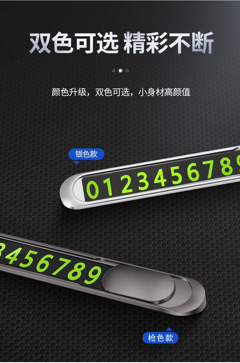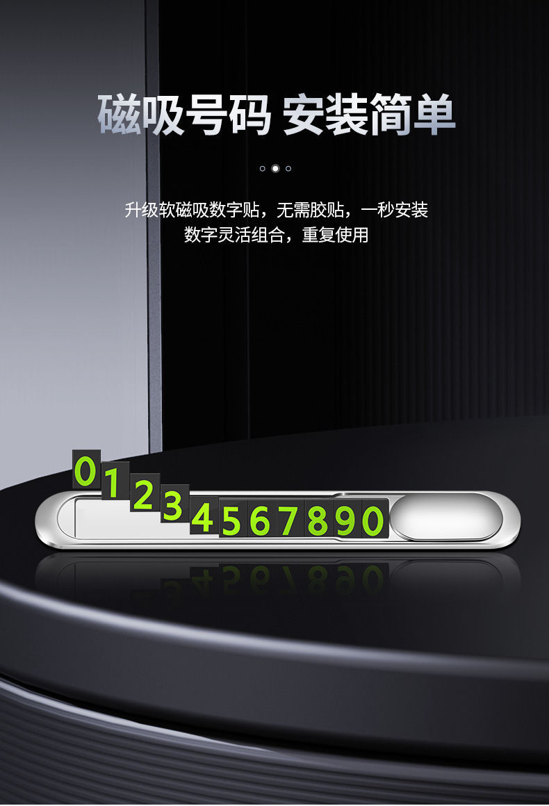 锌合金磁吸金属停车号码牌 颜色: 银色 灰色 材质:金属+硅胶磁吸数字贴 尺寸:12.5*12mm 包装:红色彩盒 【功能特点】: 锌合金金属材质大气上档次 6组夜光数字牌+底部贴两个泡棉胶 磁吸隐藏式把手一键隐藏 手机号码清晰可见