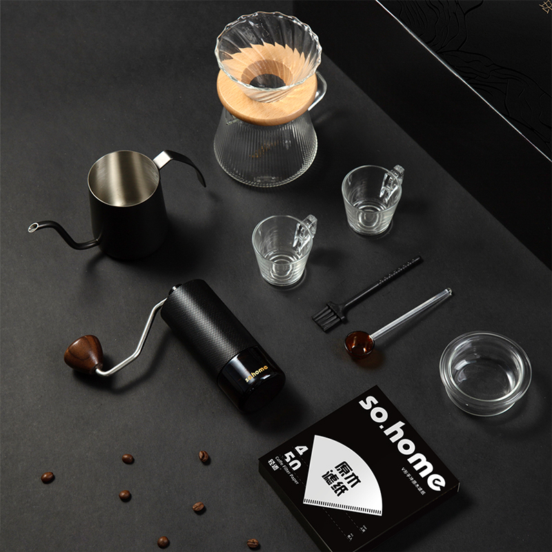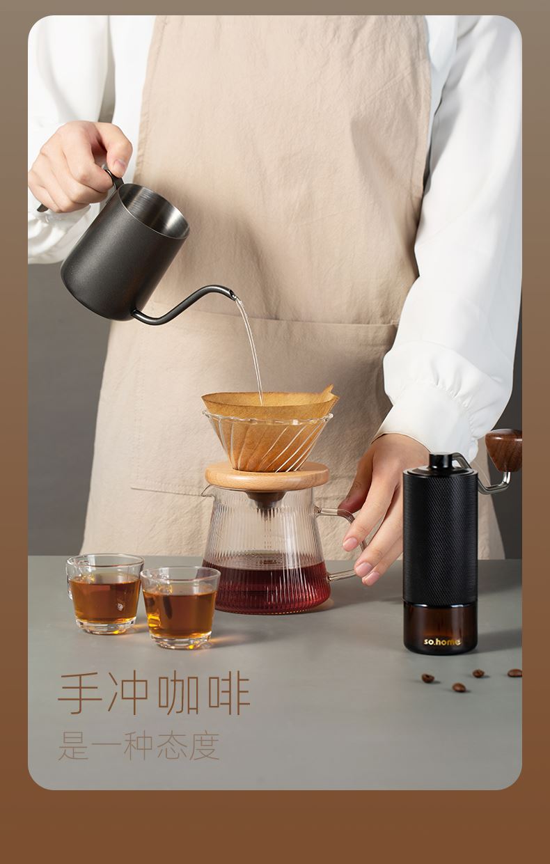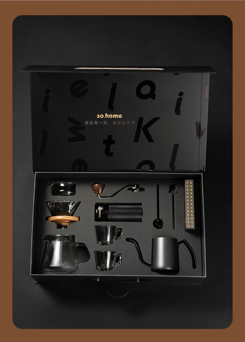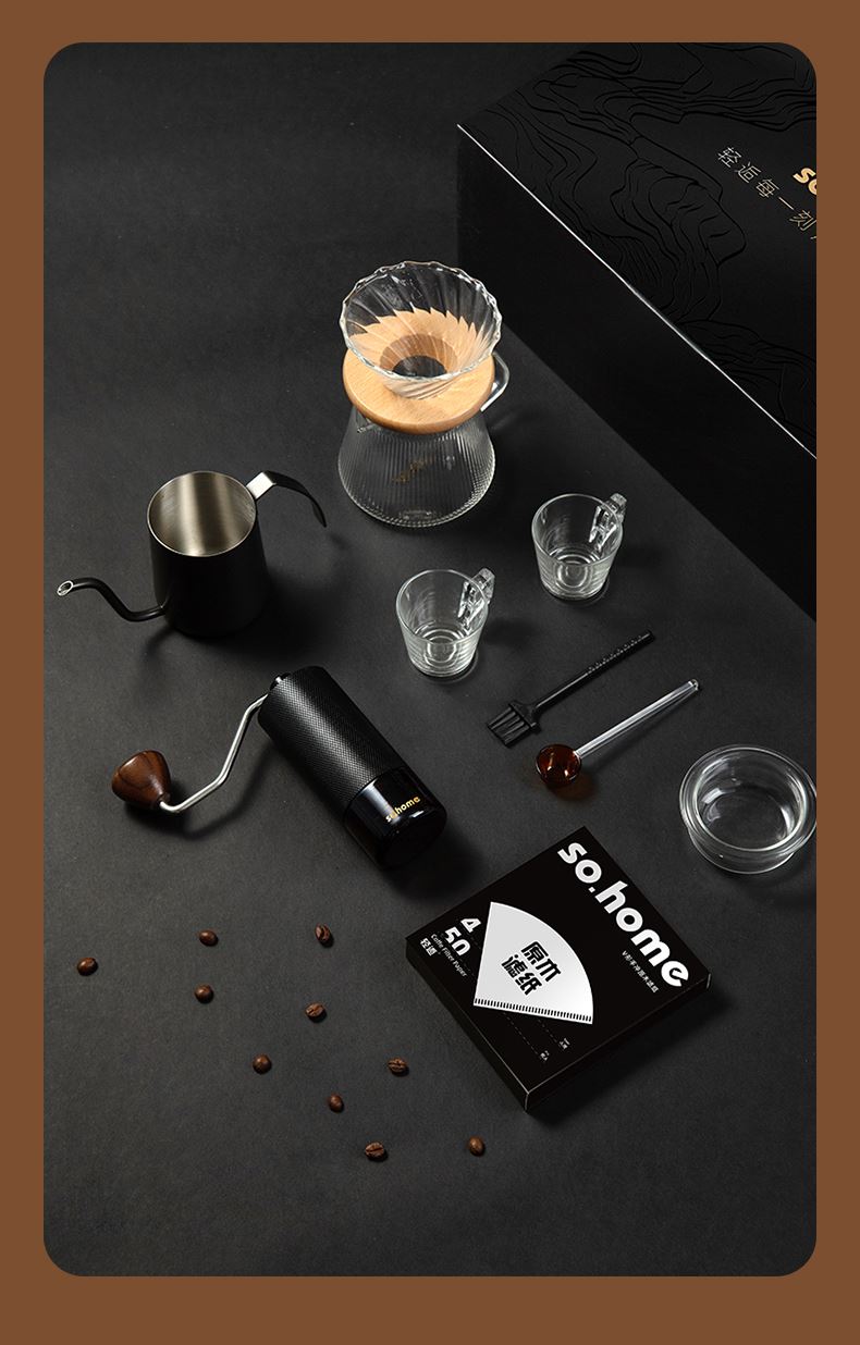 一站式整套配齐,享受有质感的冲泡体验。做自己的咖啡师在家也能享受精品咖啡,无添加萃取咖啡豆原有的味道。cnc磨豆机刀刃锋利快速切割,点位式旋转随心调节研磨粗细,滤杯旋纹导流快速萃取,分享壶V型滤嘴设计出水可控断水自如不易湔洒,高硼硅上盖可防尘可做滤斗托架可做称豆器多用途设计。