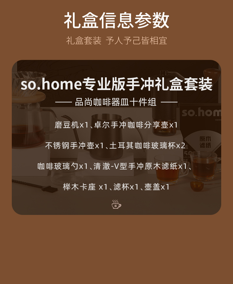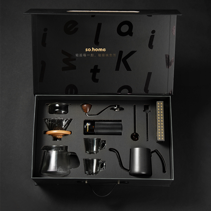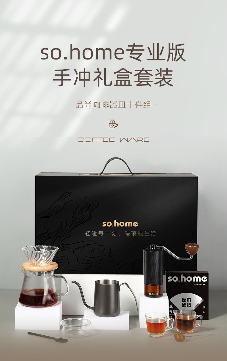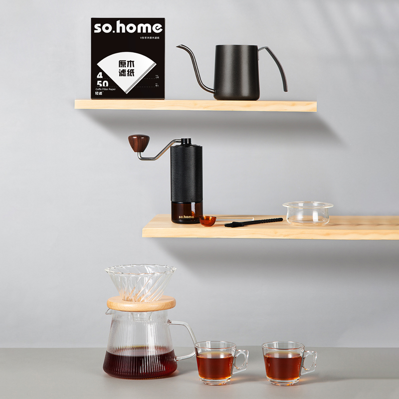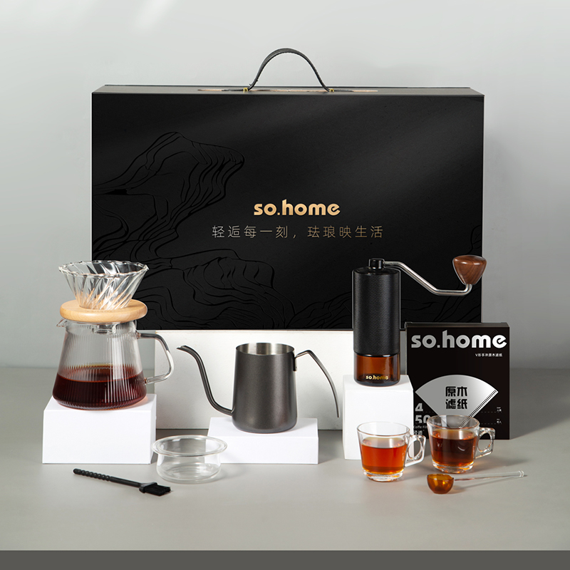 一站式整套配齐,享受有质感的冲泡体验。做自己的咖啡师在家也能享受精品咖啡,无添加萃取咖啡豆原有的味道。cnc磨豆机刀刃锋利快速切割,点位式旋转随心调节研磨粗细,滤杯旋纹导流快速萃取,分享壶V型滤嘴设计出水可控断水自如不易湔洒,高硼硅上盖可防尘可做滤斗托架可做称豆器多用途设计。