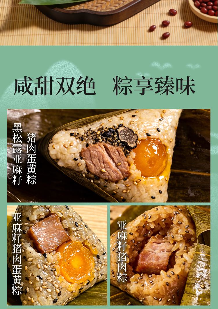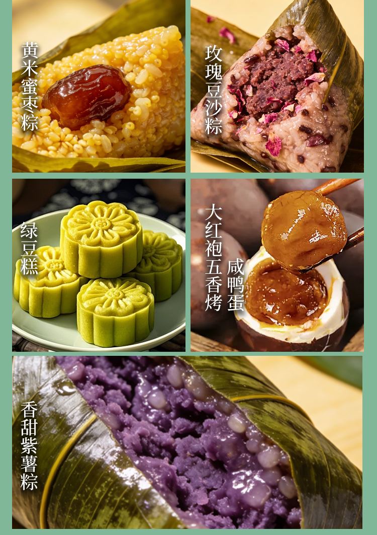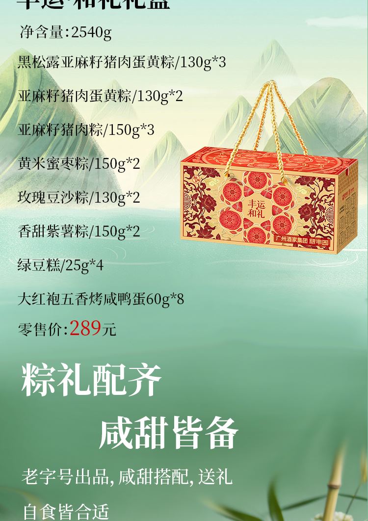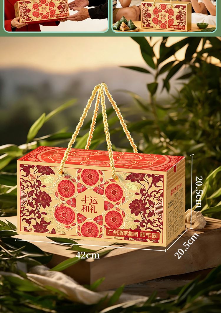 礼盒尺寸:42*20.5*20.5 内容物: 黑松露亚麻籽猪肉蛋黄粽/130g * 3 亚麻籽猪肉蛋黄粽/130g * 2 亚麻籽猪肉粽/150g * 3 黄米蜜枣粽/150g * 2 玫瑰豆沙粽/130g * 2 香甜紫薯粽/150g * 2 绿豆糕/25g * 4 大红袍五香烤咸鸭蛋60g * 8 规格:2540g 保质期:4个月 百年广府,地道粤味,广州酒家 非遗匠心,粤菜标杆,国民品质之选 一席岭南风味,四季匠心好礼,认准广州酒家